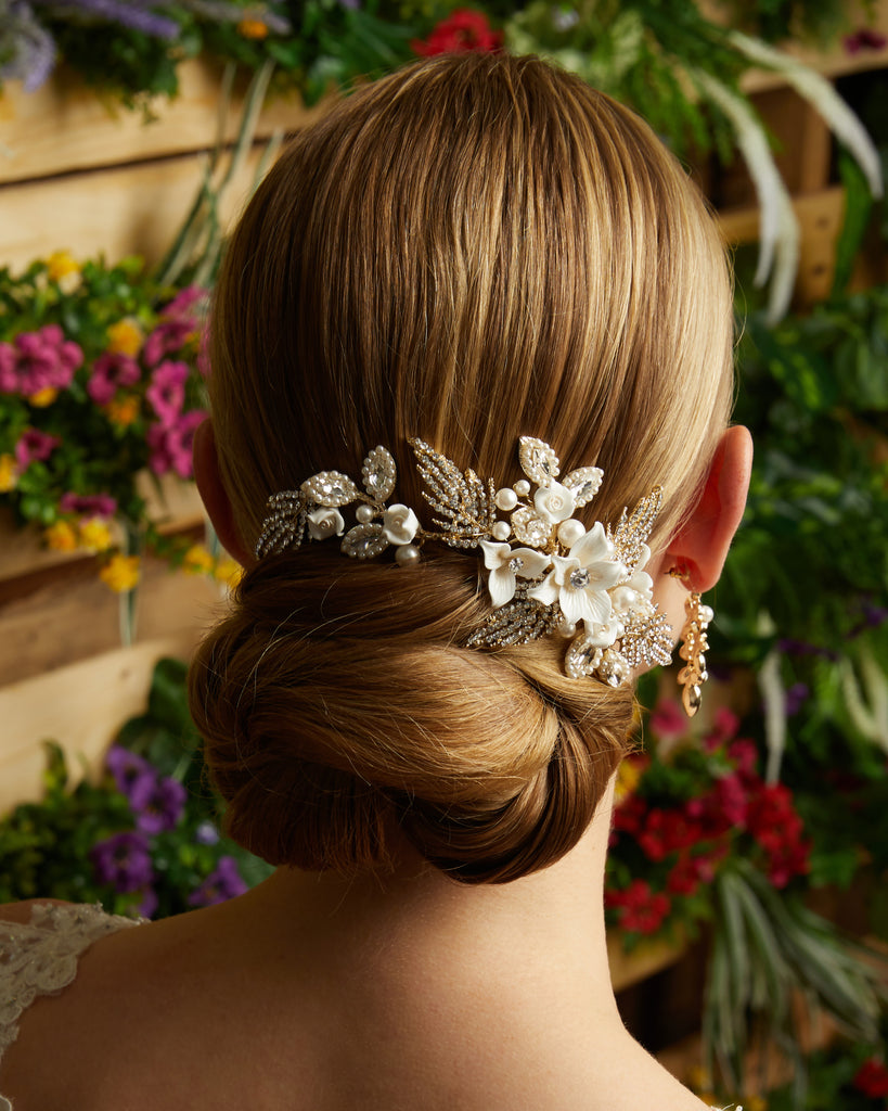 Rhinestone leaf clip with porcelain flowers and pearls. Available in gold or silver