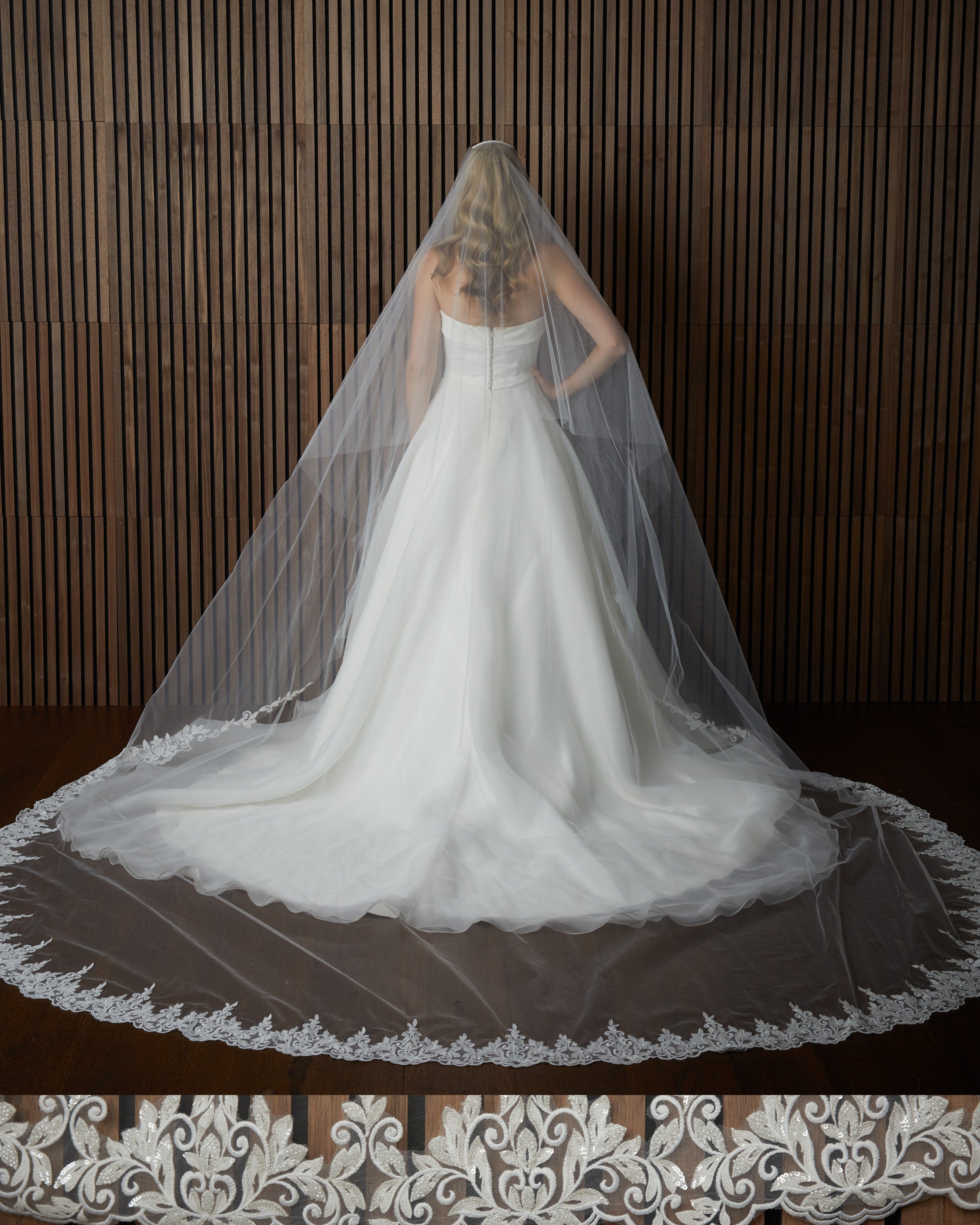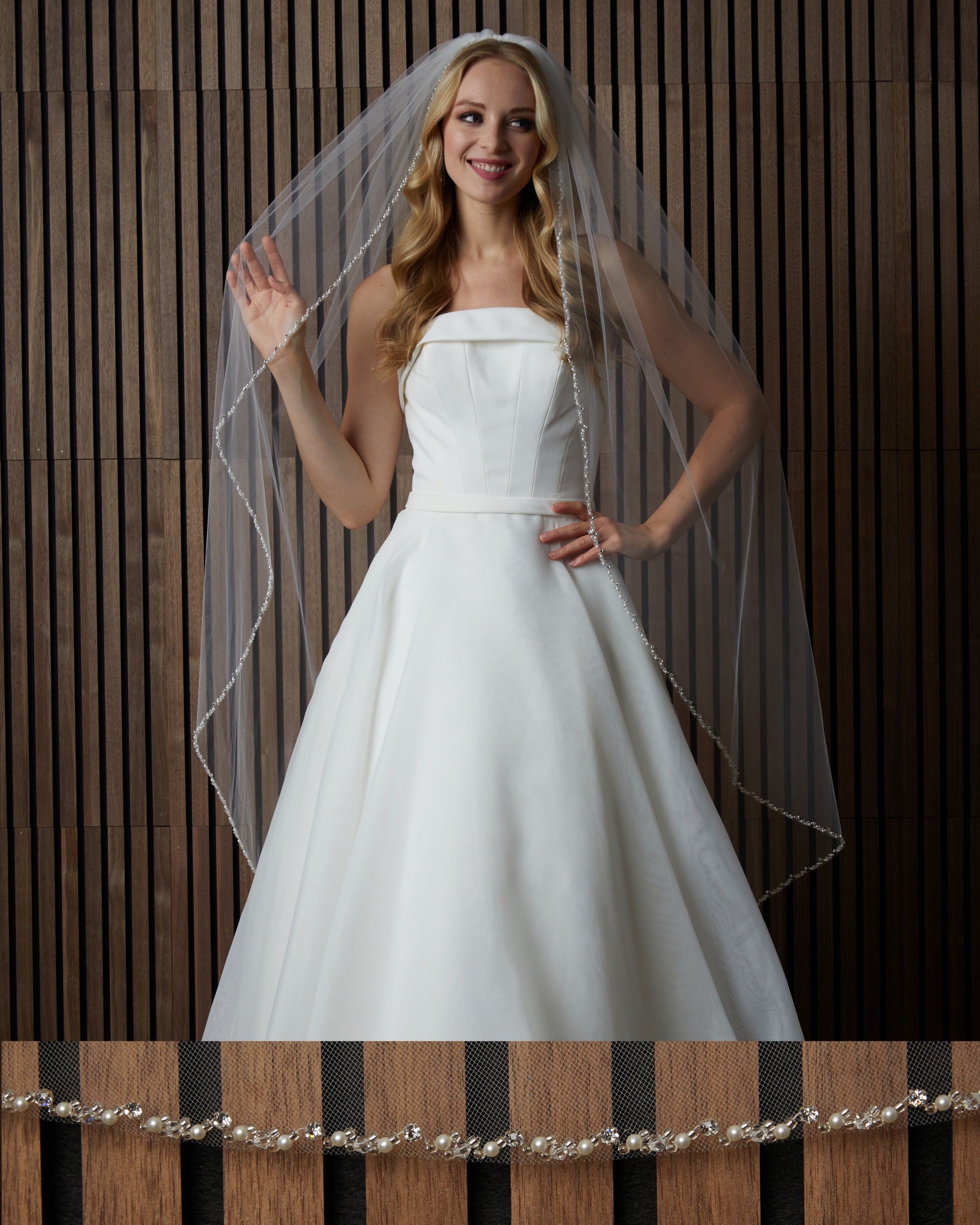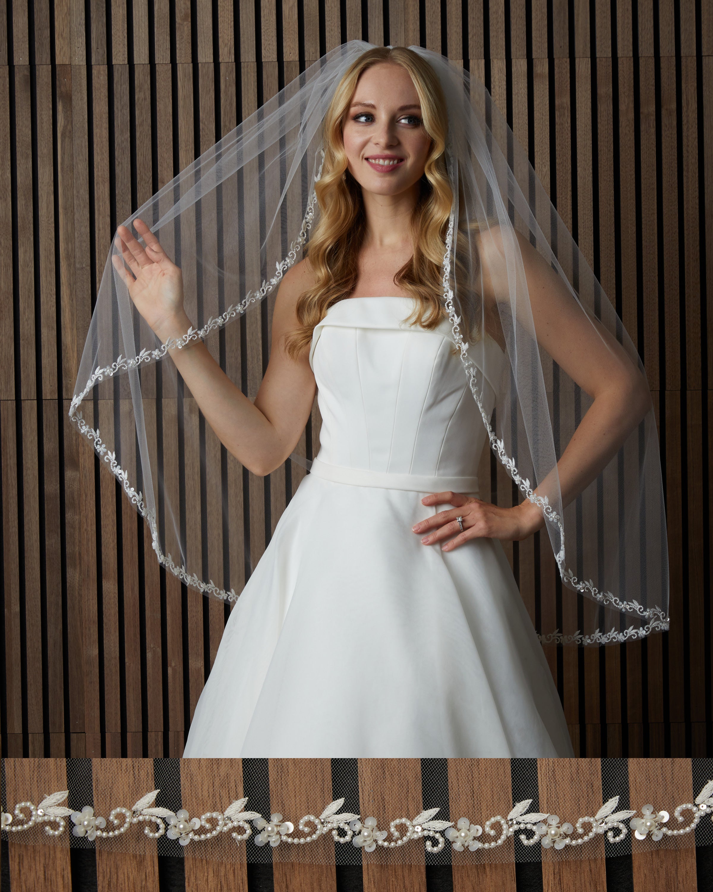 Lace and scattered pearl edge soft luxe veil. Lace starts 28” down , pearls start 4” down.