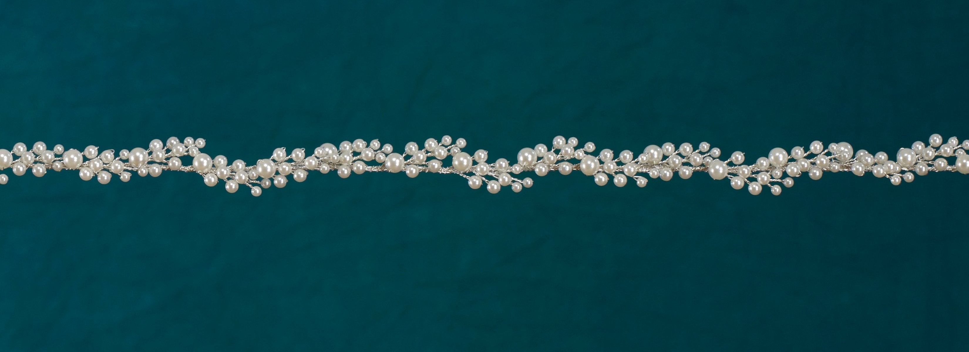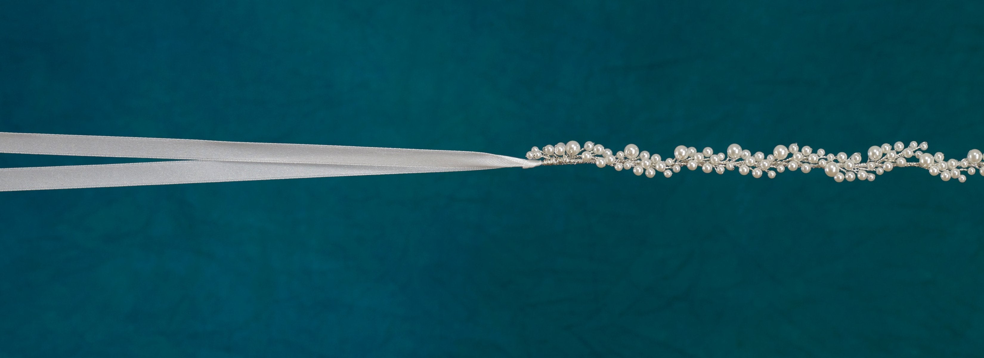 Rhinestone and pearl belt on ribbon. Available in gold or silver. 3/8ā€ wide x 17ā€ long