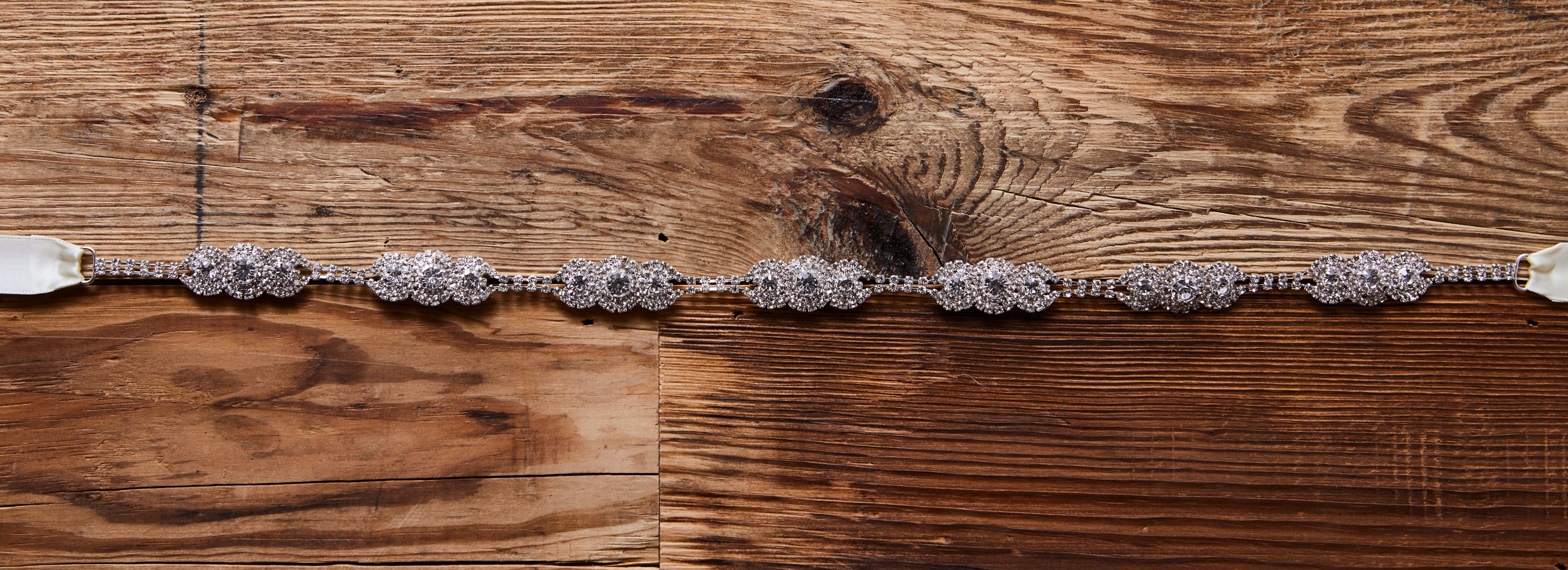 Rhinestone and pearl belt on ribbon. Available in gold or silver. 3/8” wide x 17” long