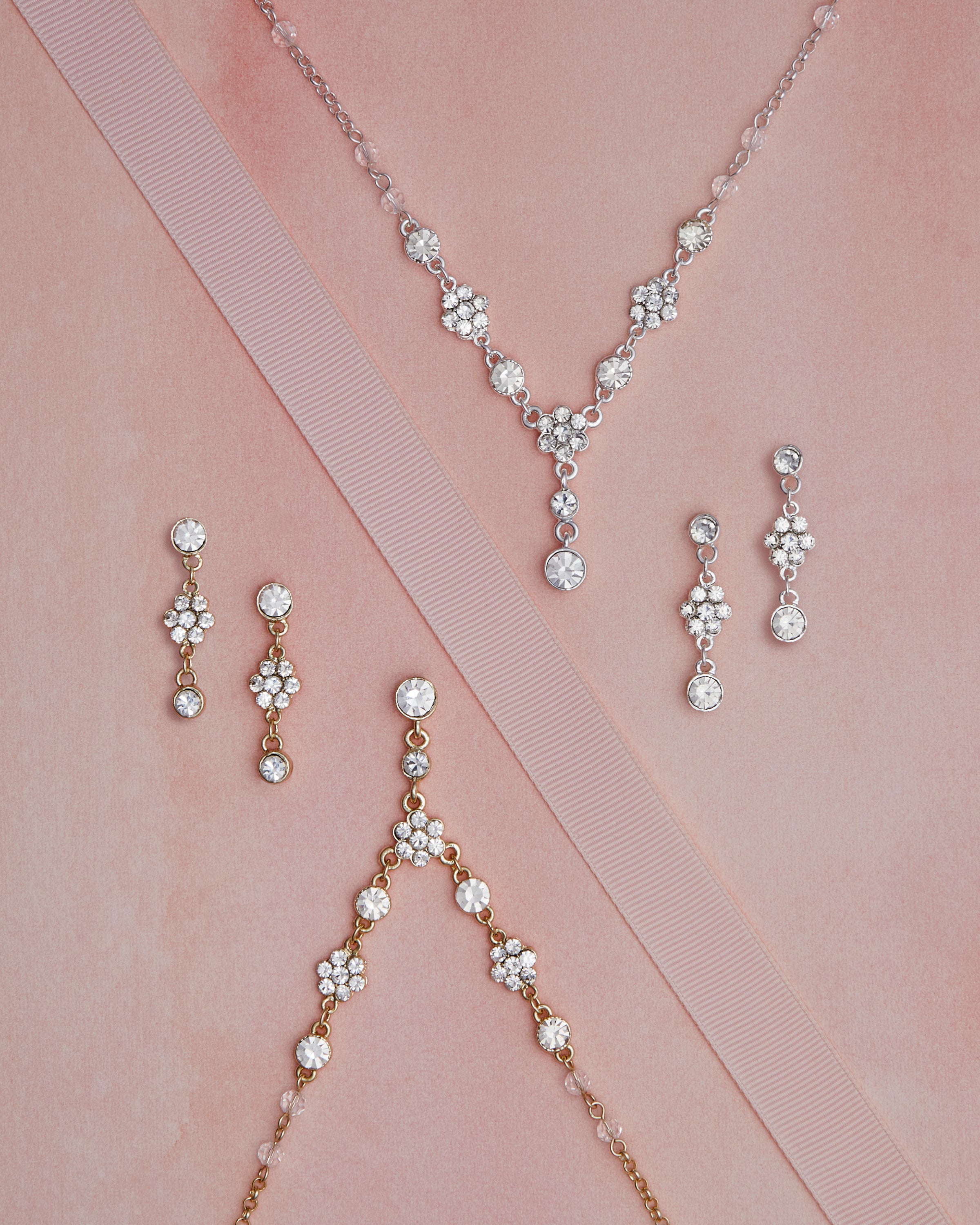 Our jewelry collection is thoughtfully designed using rhinestones, pearls, porcelain flowers, and other elegant components. Each piece is crafted to coordinate seamlessly with veils, headpieces and gowns making it the perfect finishing touch.