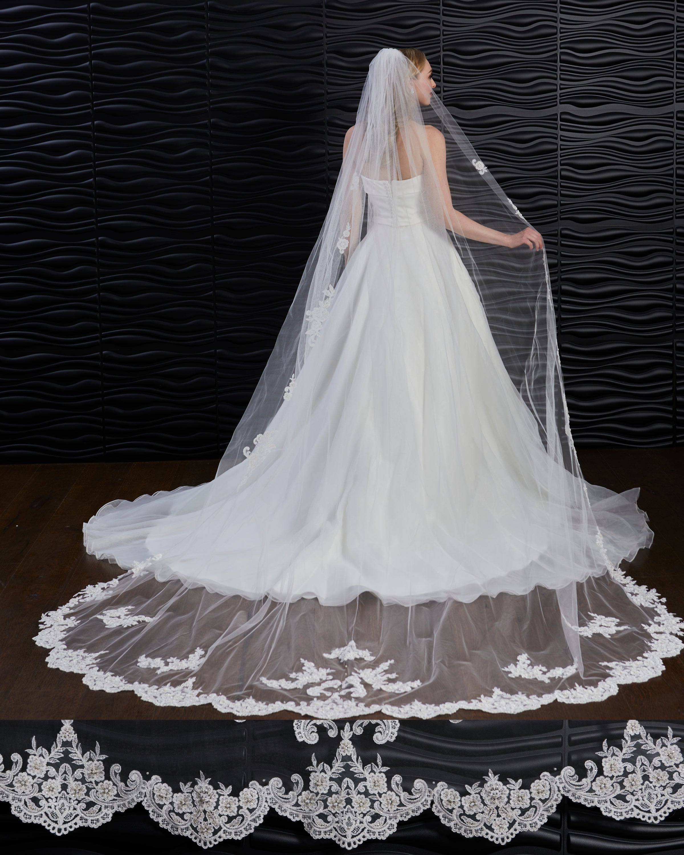 Scalloped ivory and champagne lace edge veil with sequins and pearls. Lace appliques up sides of veil. Lace starts 18” down.