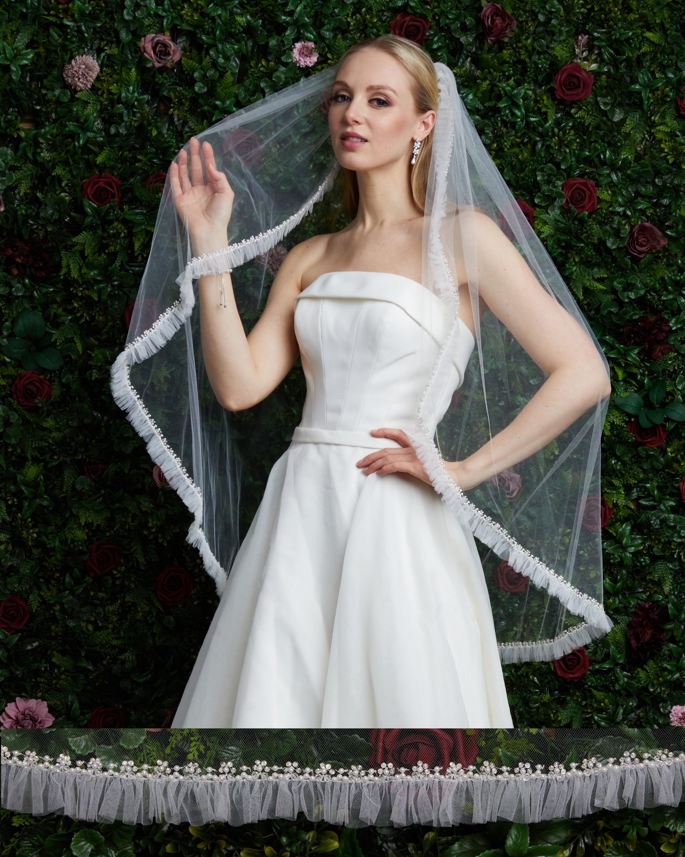 rolled edge, lace starts 18” down, scattered pearls and rhinestones on lace