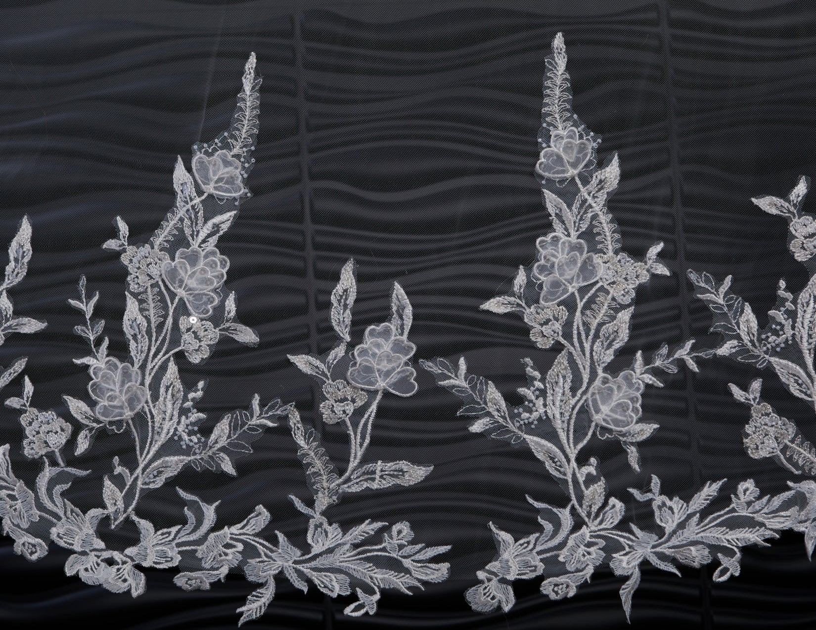 Cut out floral and leaf lace with sequins and beads. Lace starts 16” down.