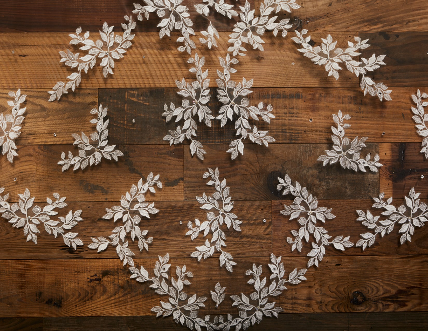 Cut out floral and leaf lace with sequins and pearls with center lace appliques. Lace edge starts 18” down.