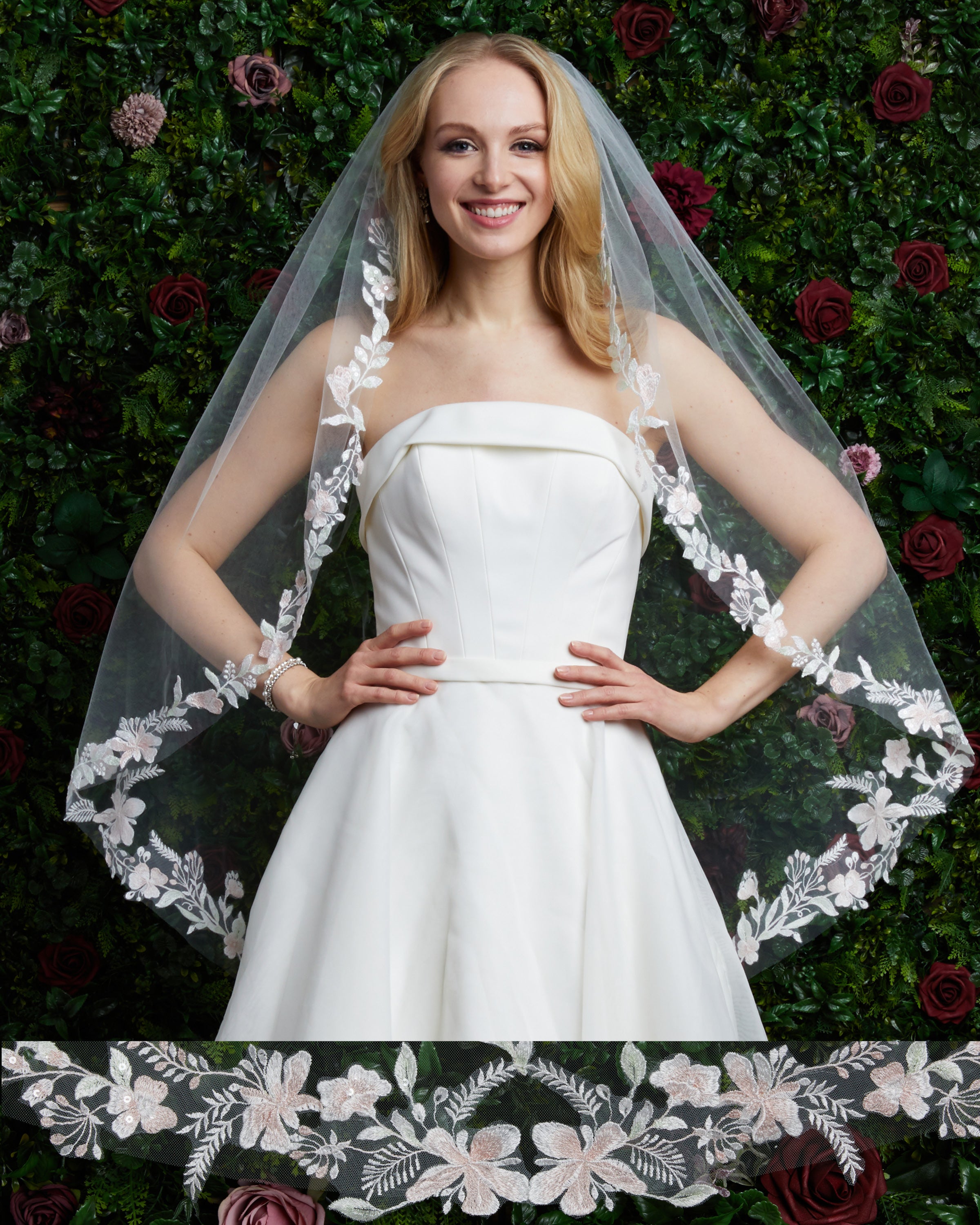 Blush floral lace with sequins. Lace starts at comb