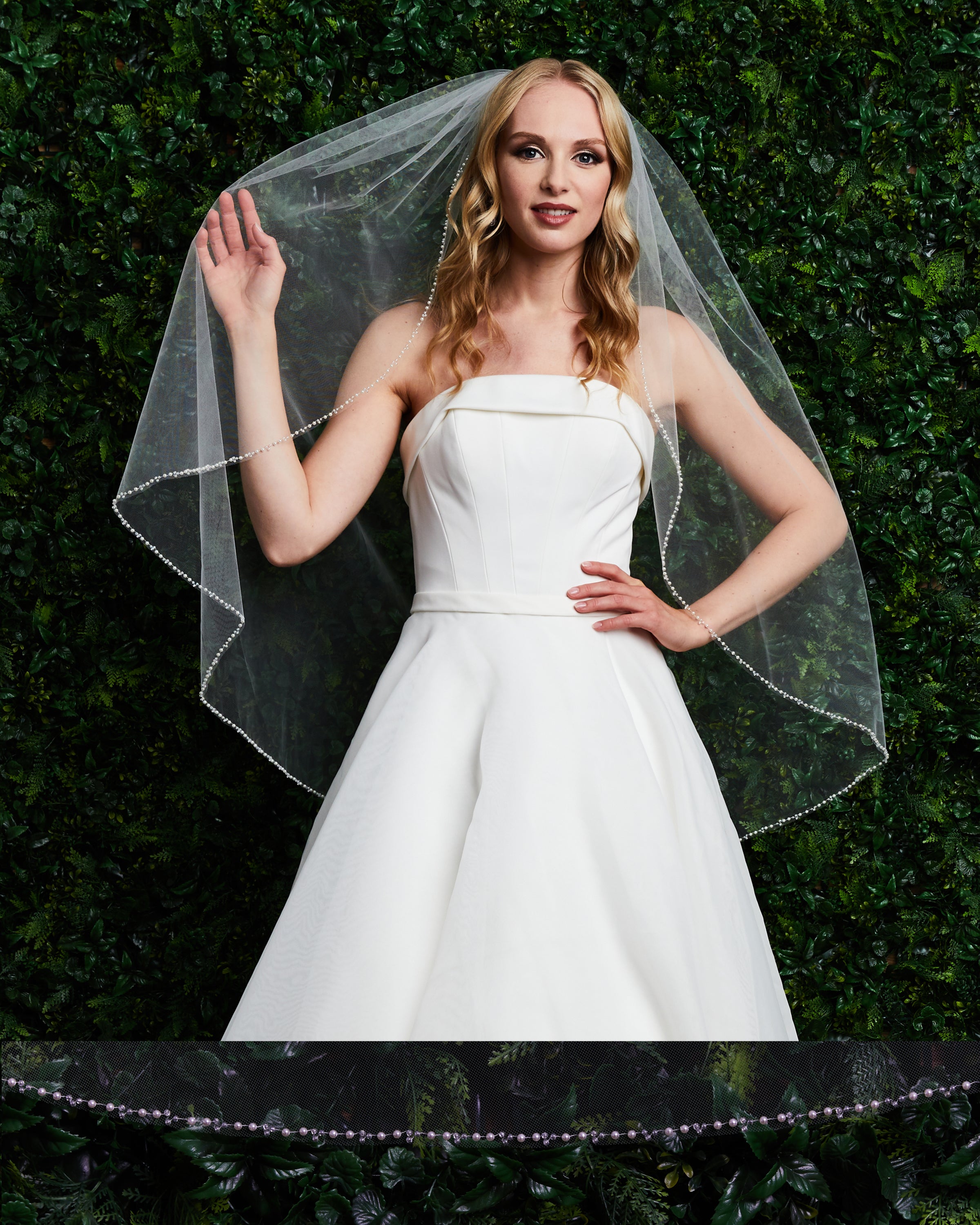 Glitter veil with crystal beaded edge. Also available in fingertip