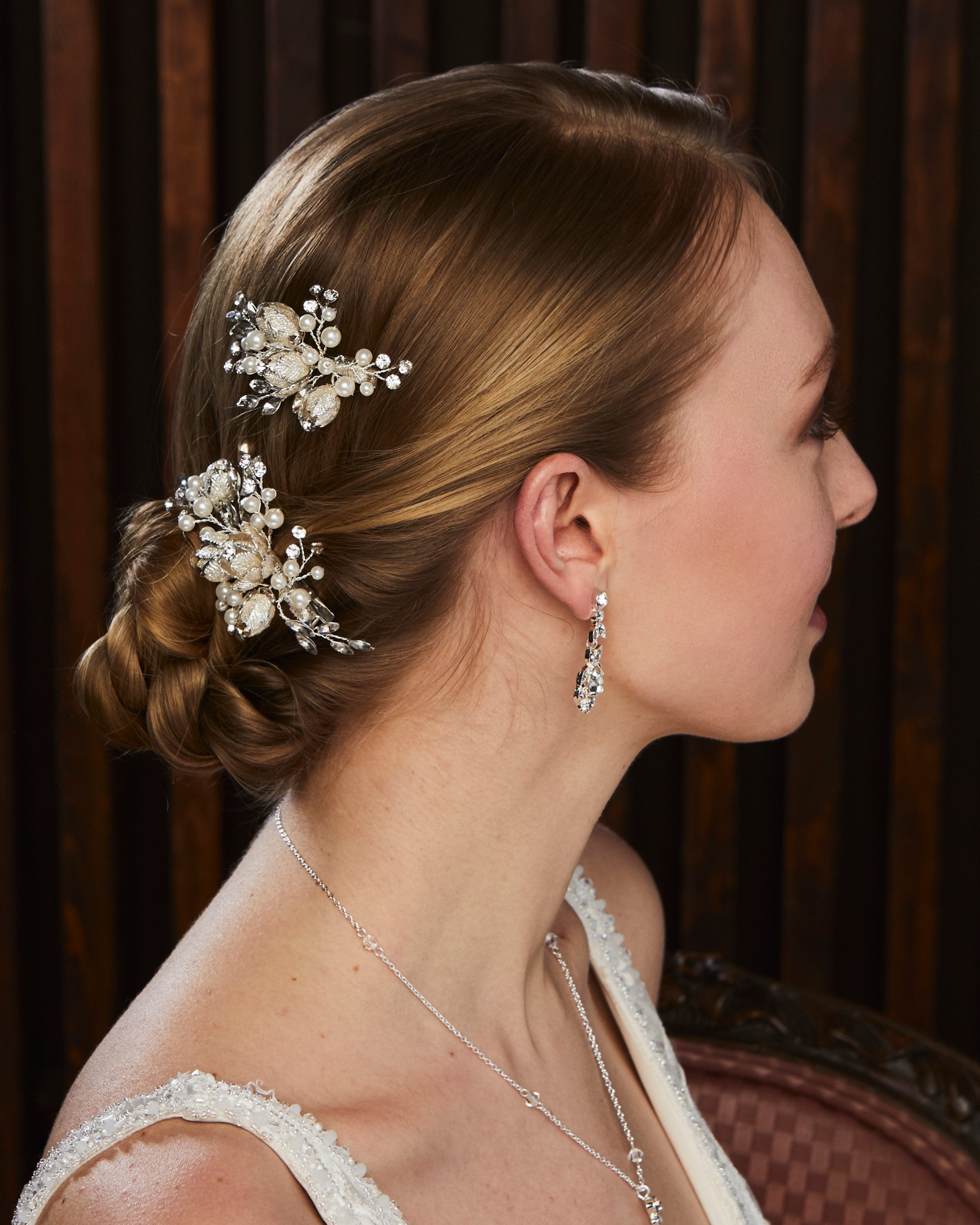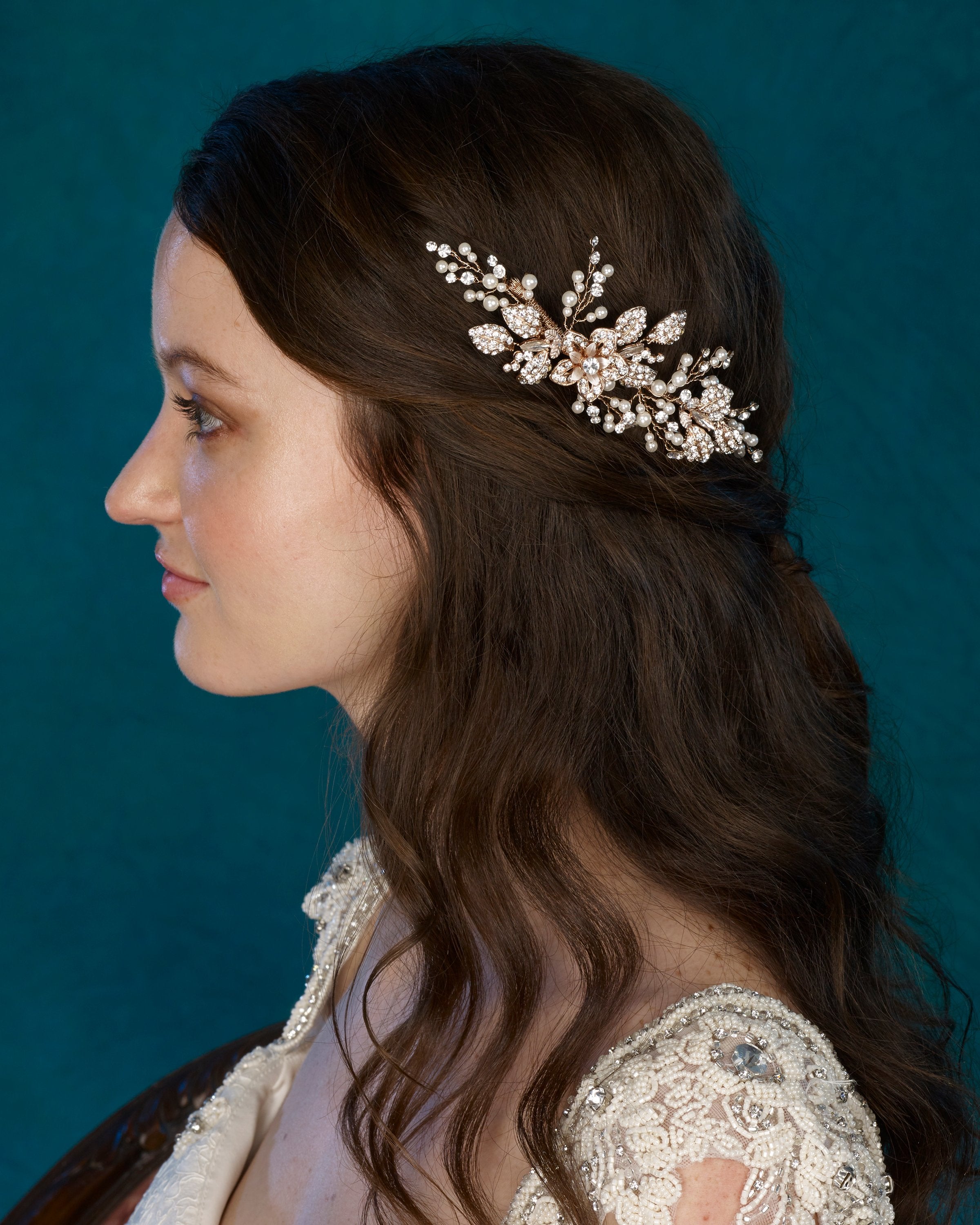 Handcrafted using rhinestones, pearls, beads, cast metal components, crystals, and other fine finishes, our headpieces are designed to bring timeless beauty and refined sparkle to a bride’s look. Each piece is silver or gold plated to ensure longevity, durability, and lasting quality.