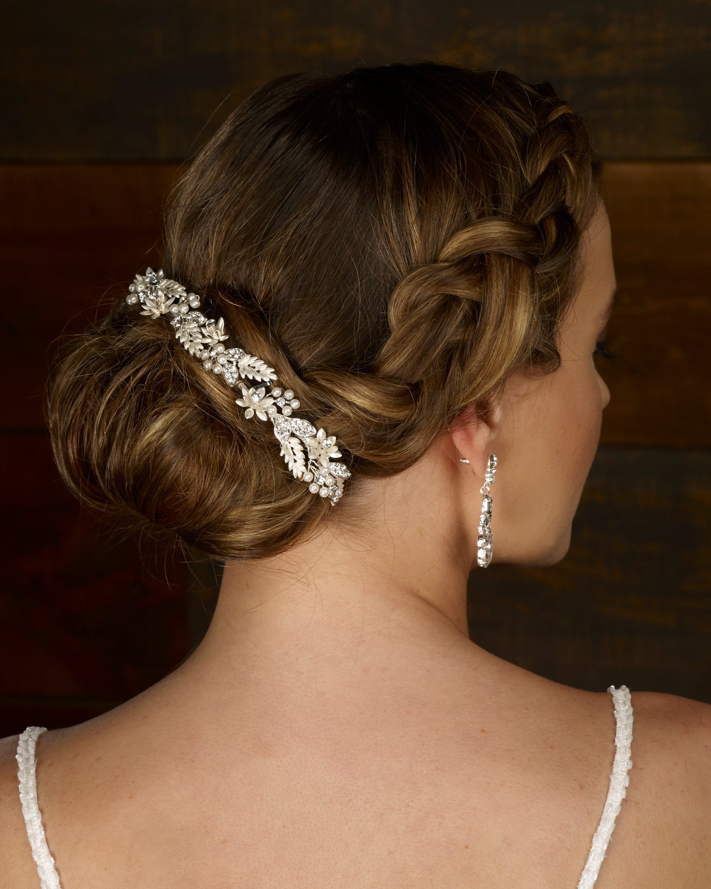 Hair accent with rhinestones, metal flowers, metal leaves and pearls