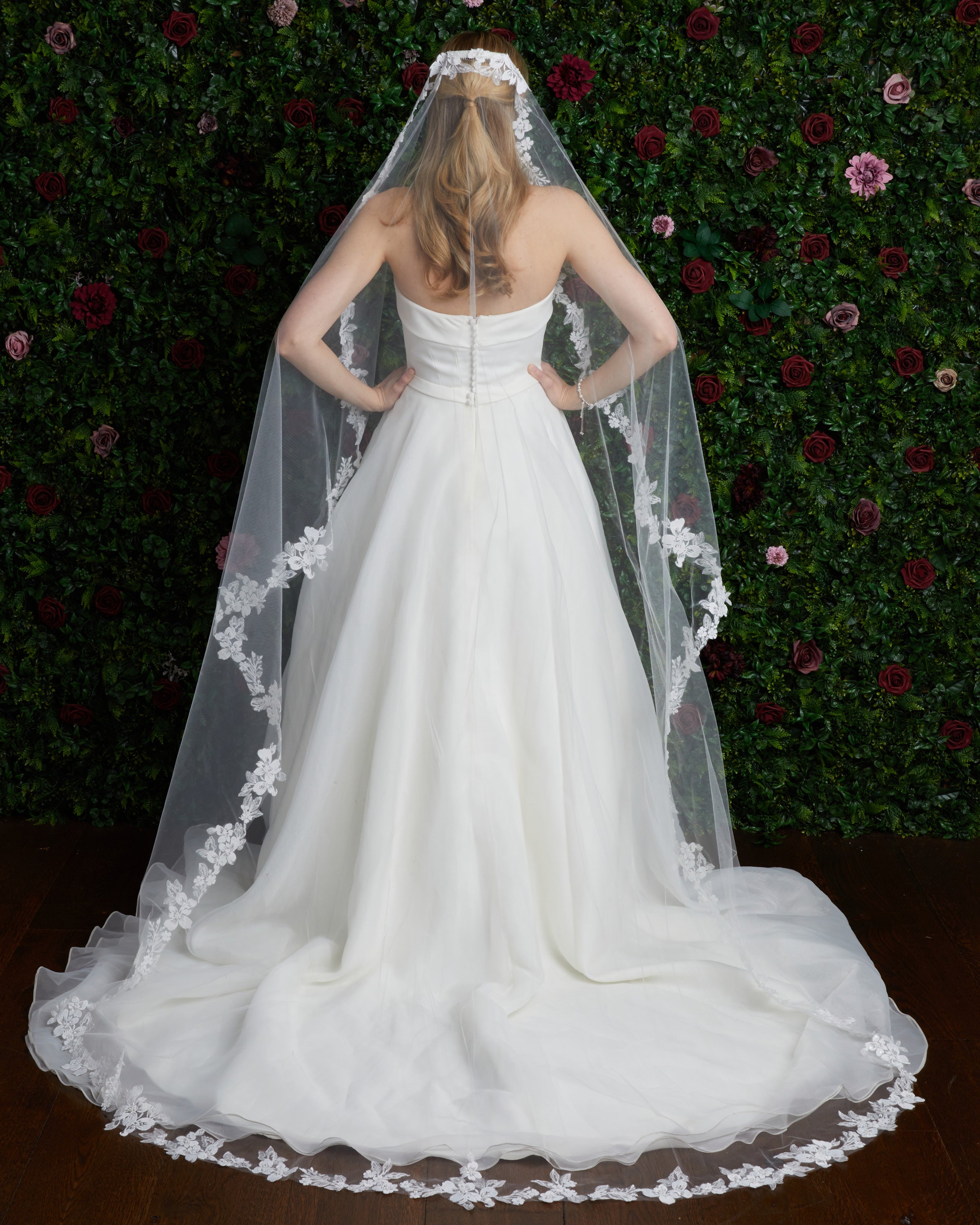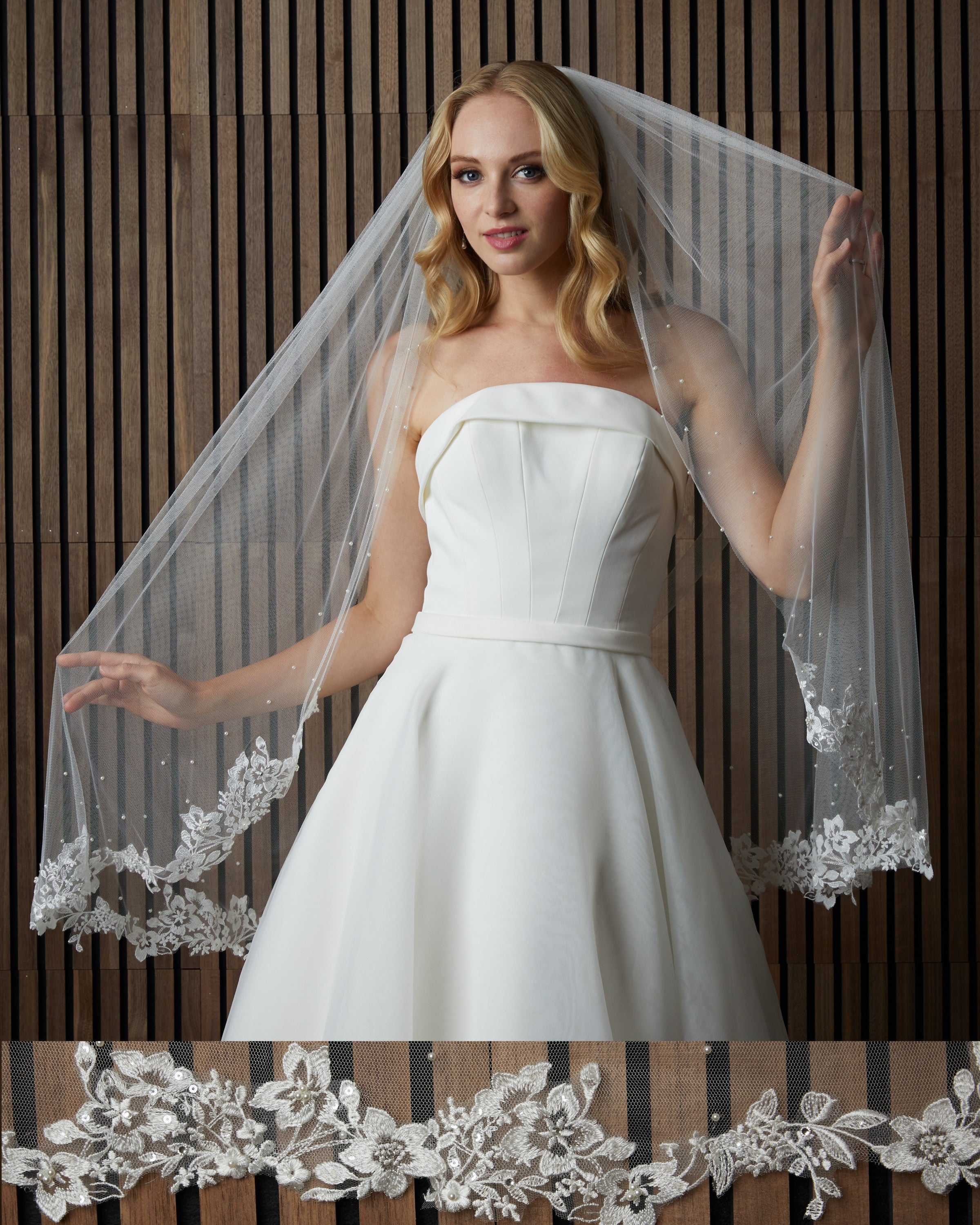 Lace and scattered pearl edge soft luxe veil. Lace starts 28” down , pearls start 4” down.