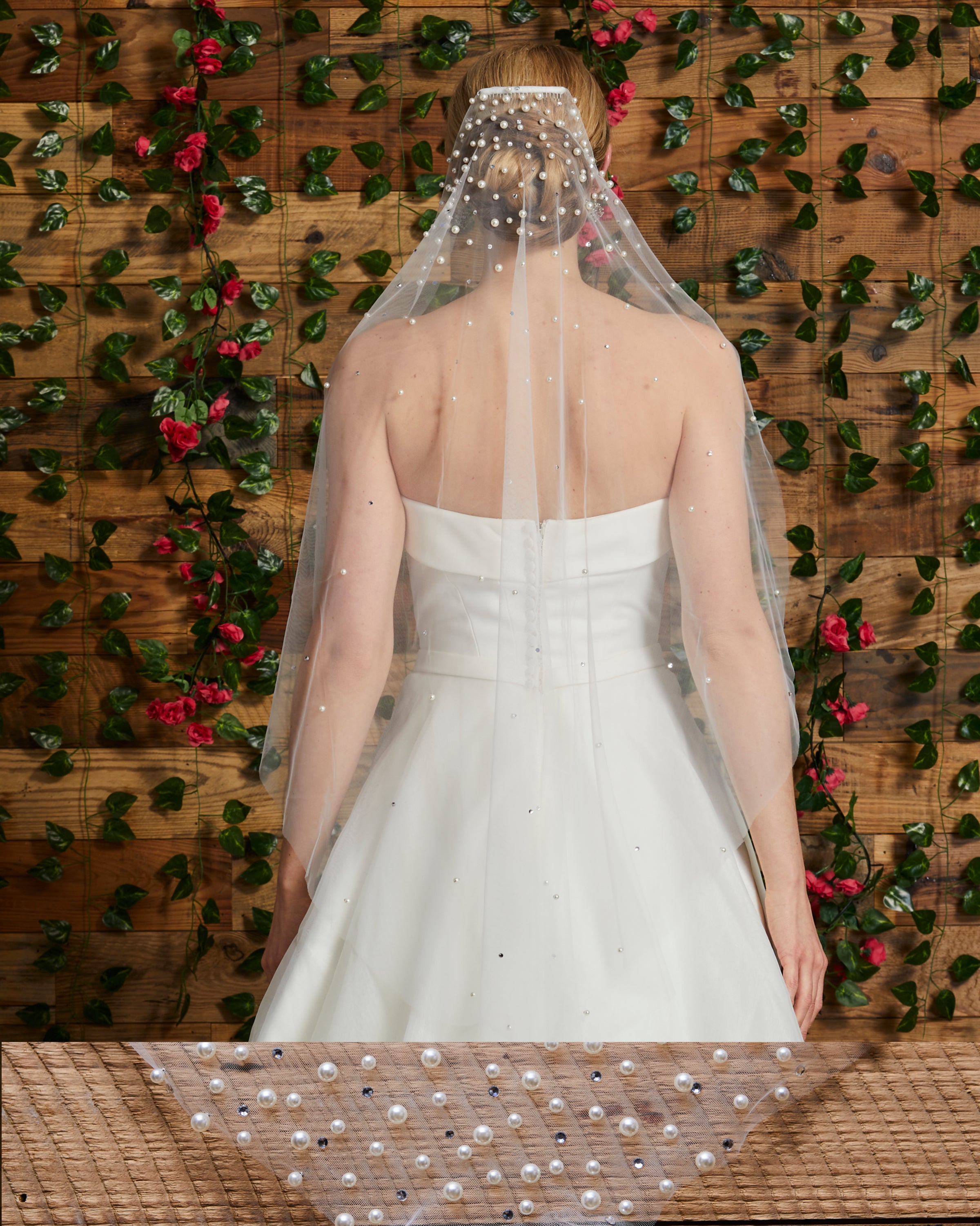 Pearl and rhinestone scattered veil on silky tulle (sewn flat)