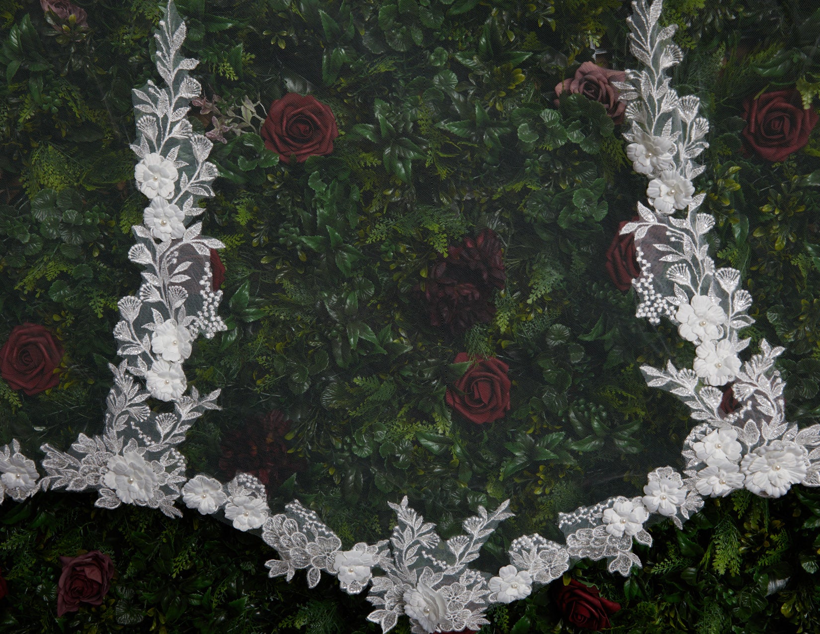 Scalloped lace edge with 3D flowers, sequins and pearls. Lace starts 42” down