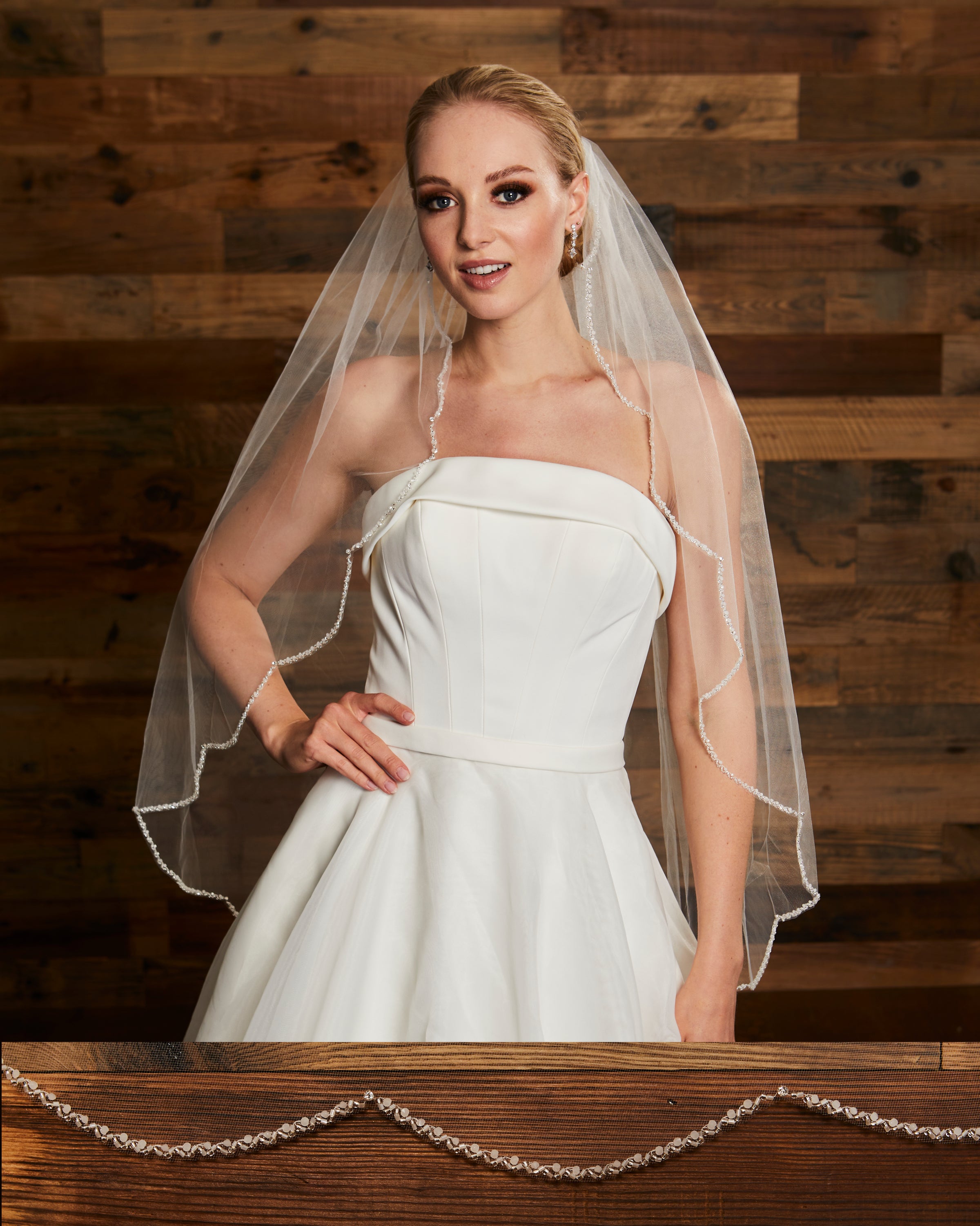 Lace edge veil with rhinestones. Lace starts 19” down.