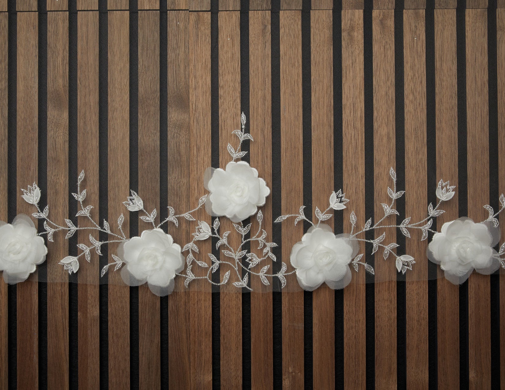 3D Flower veil with beaded leaves. Design starts 42” down. Metal comb