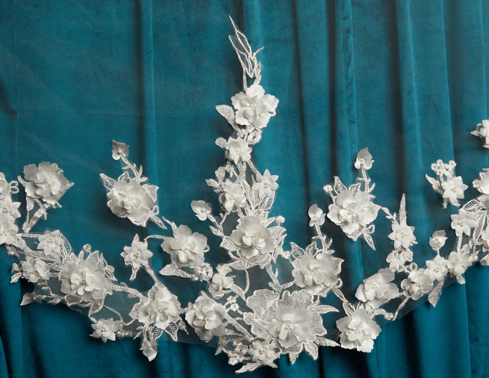 3D flower lace with pearls. Lace starts 42” down.