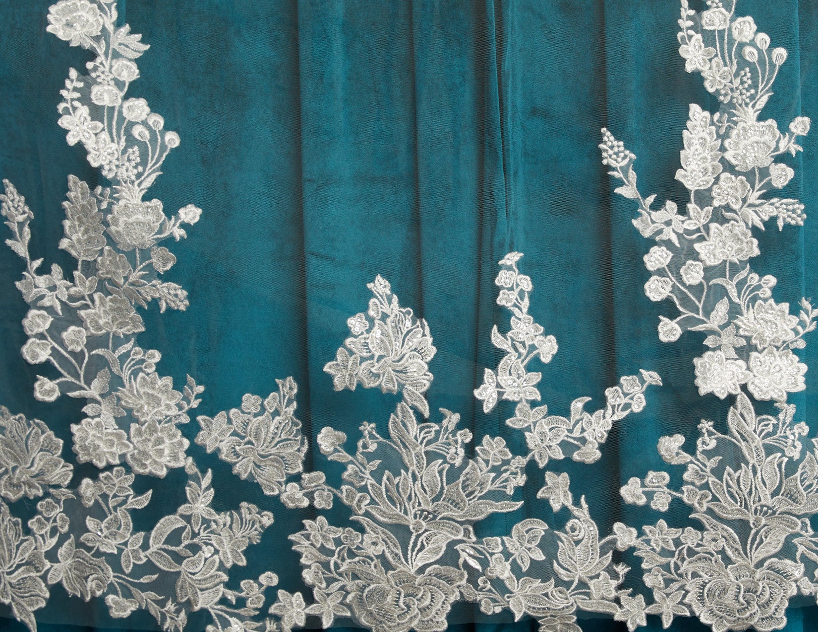 Sequin lace edge with pearls and rhinestones. Lace starts 18” down.