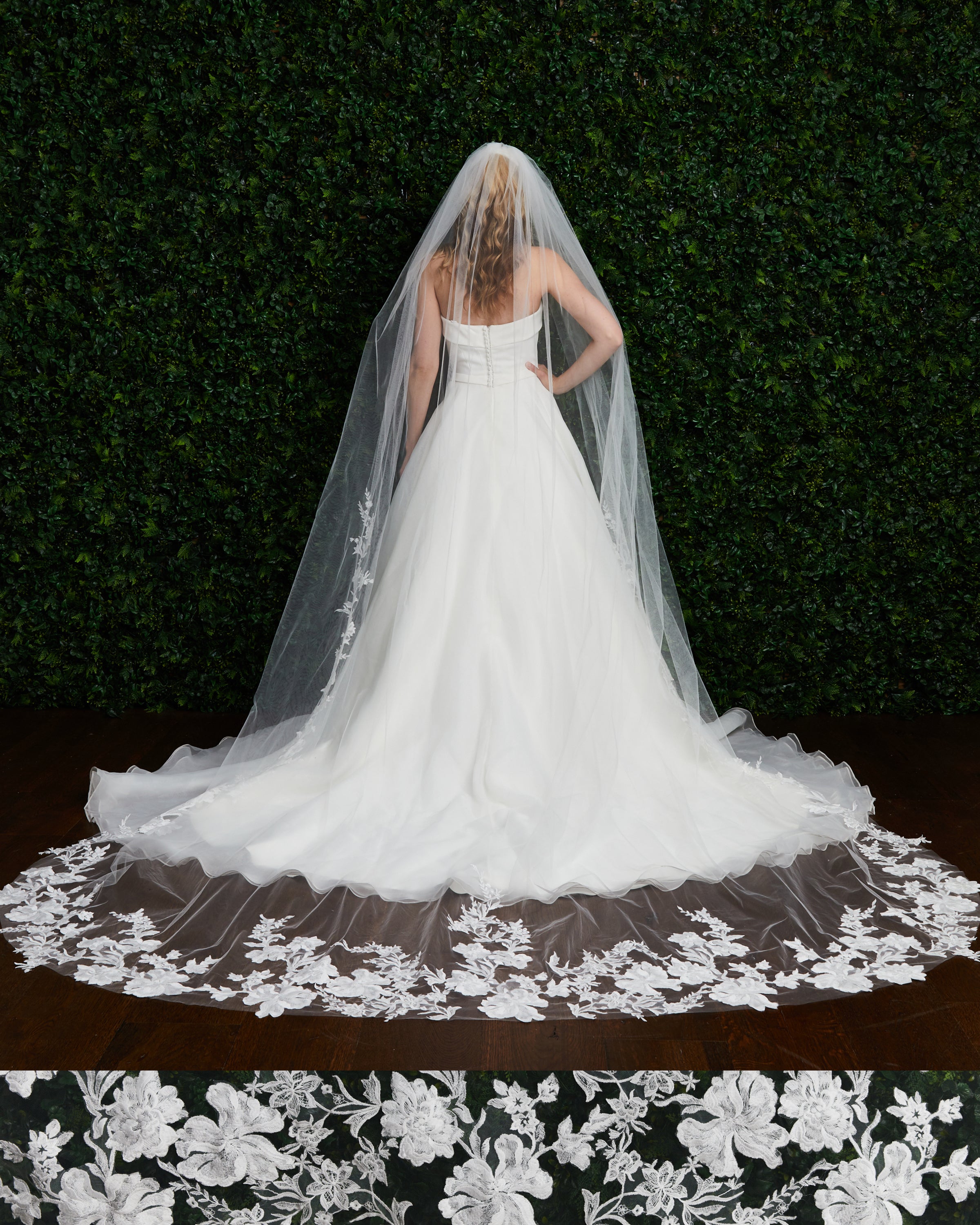 Lace floral veil. Lace starts 42” down, no beading