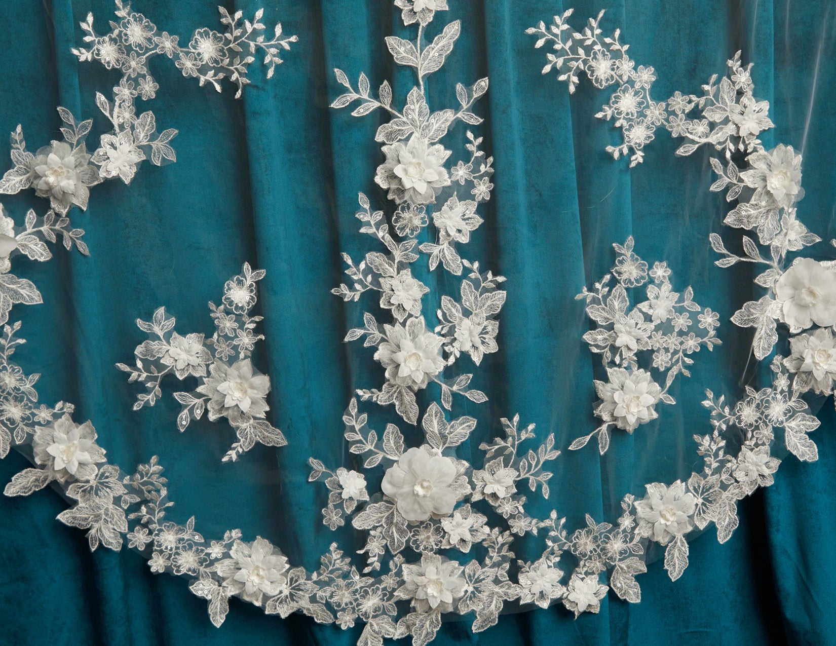Lace veil with 3D flowers and sequins. Lace starts 40” down