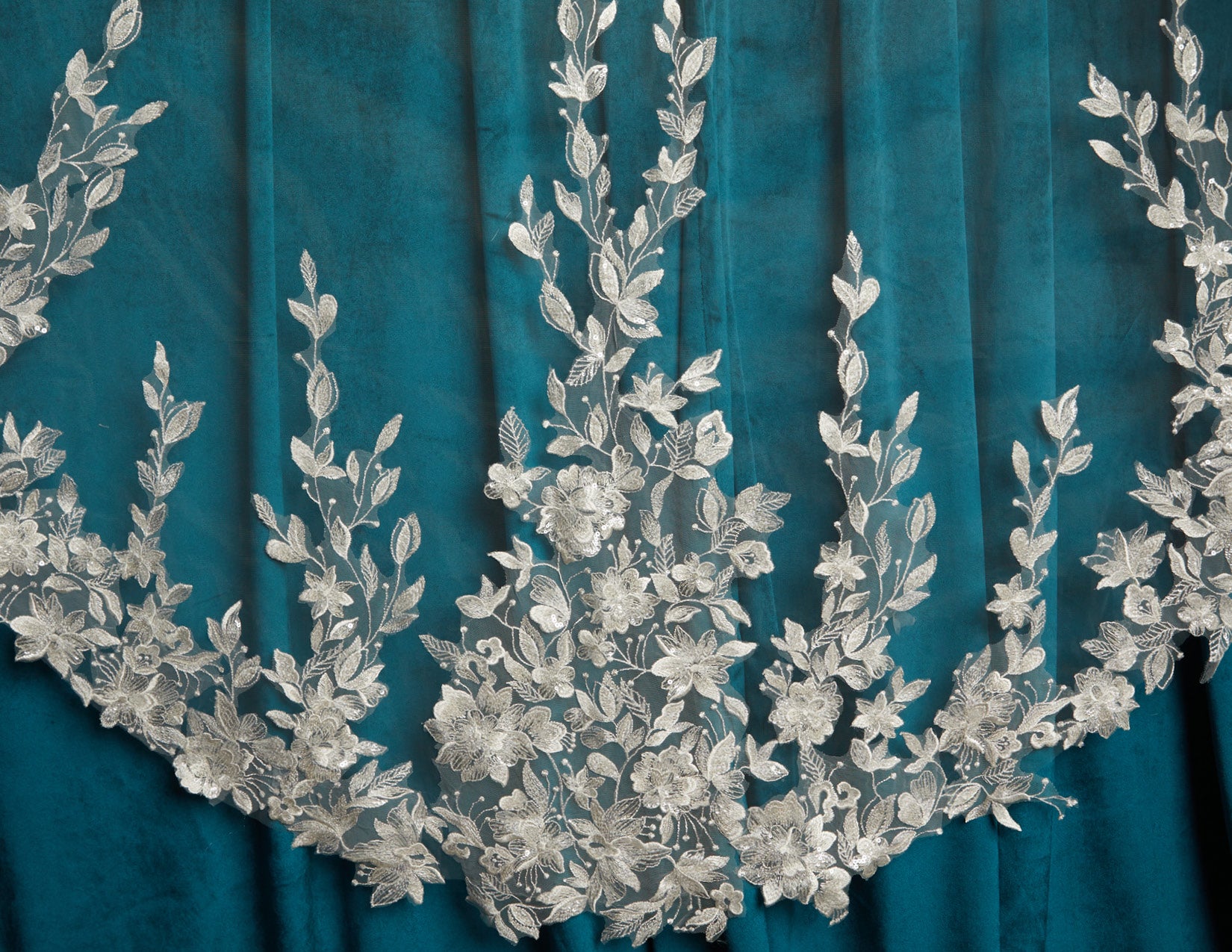 Tapered to 74” at top. Floral lace applique edge and center with sequins and scattered pearls and rhinestones.