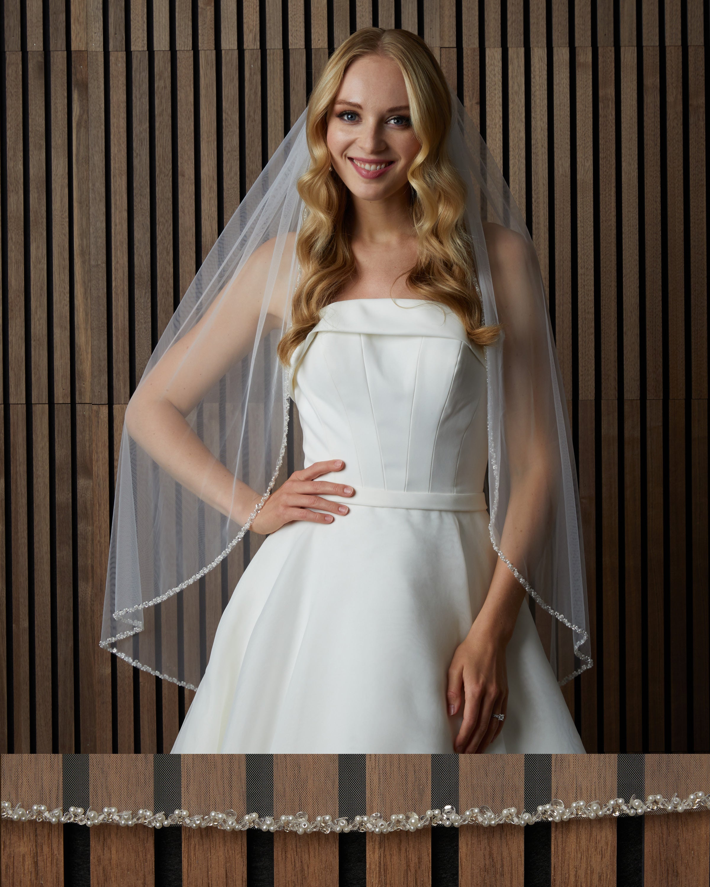 Beaded edge with pearls, sequins and crystals on silky tulle, metal comb