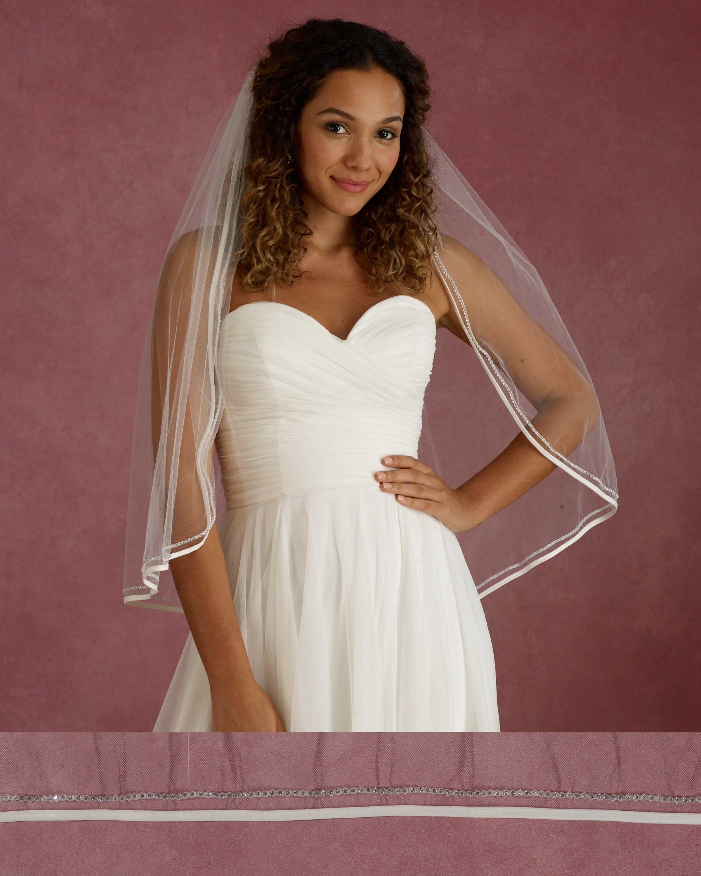 bias satin and rhinestone edge. Satin bias available in ivory, white and rum pink