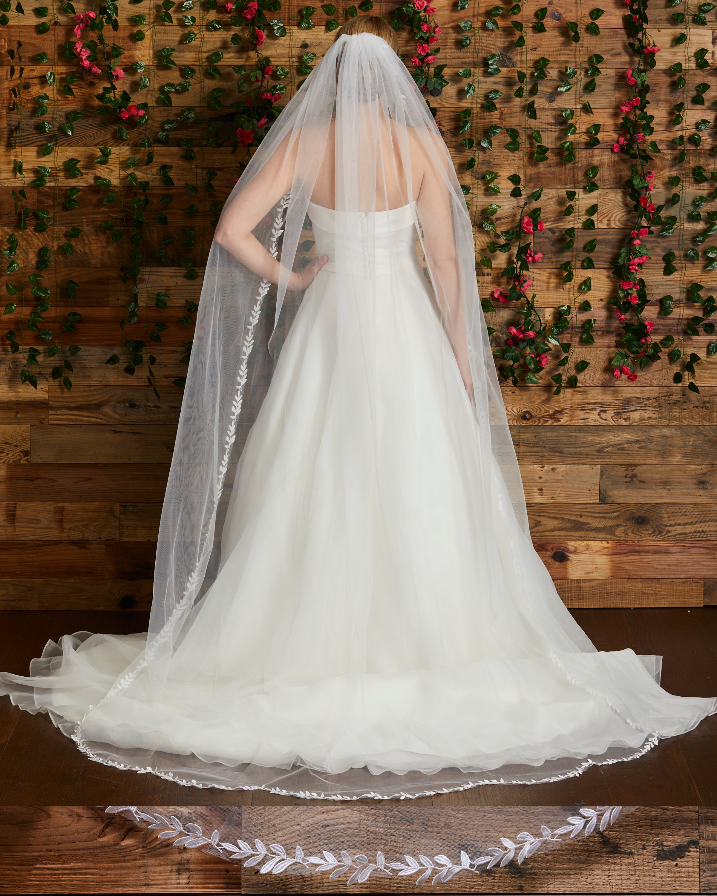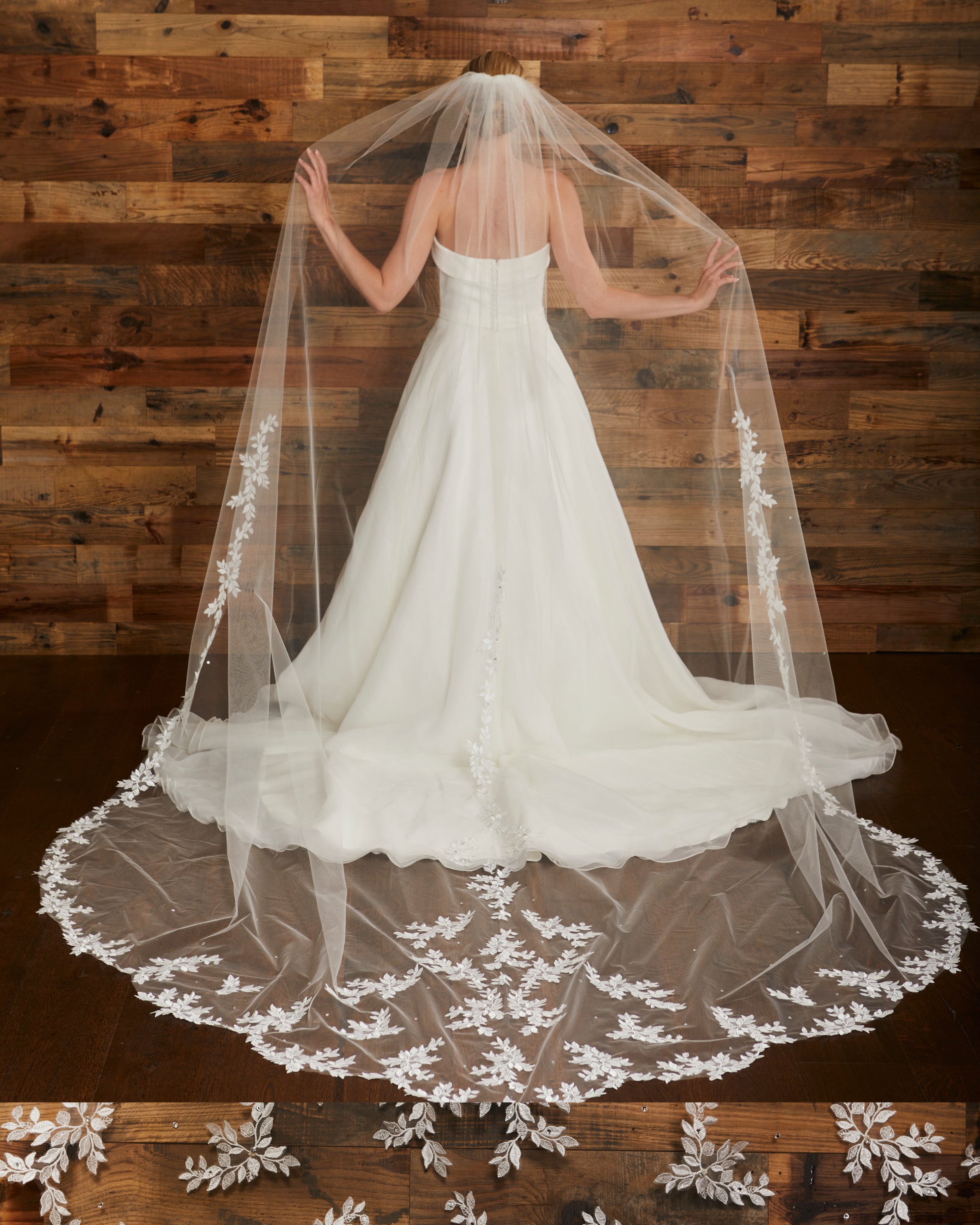 Tapered to 74” at top. Scalloped leaf applique lace with sequins and scattered rhinestones. Lace starts 42” down.