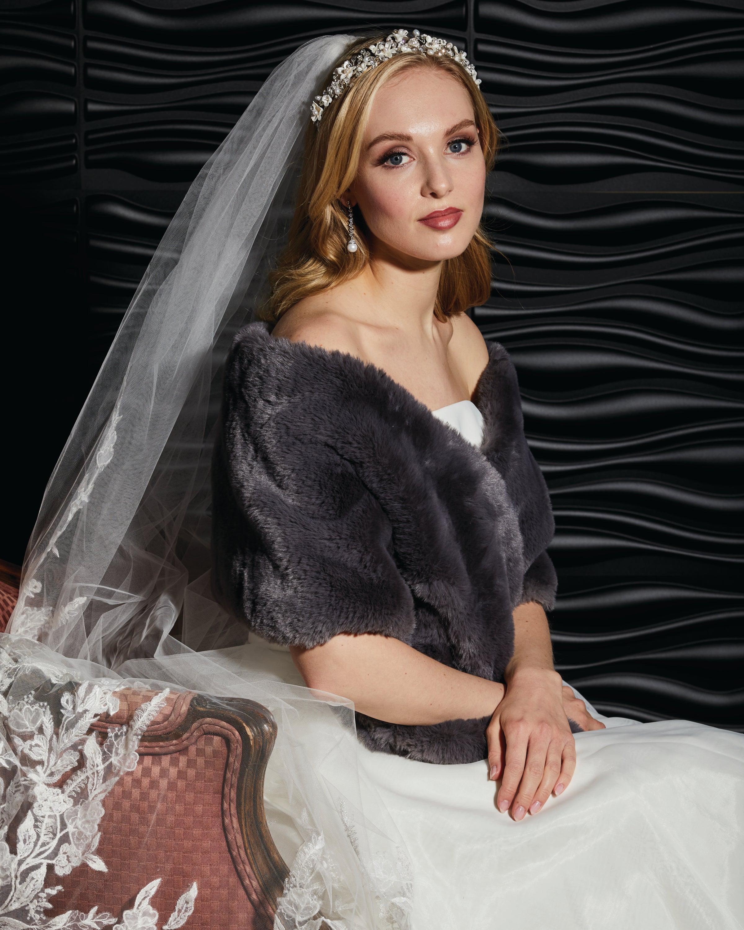 Our capes are designed to add softness, drama, and elegance to a bride’s look. Our “fur” capes are crafted from plush, luxurious faux furs for a warm, elevated feel, while our organza and tulle styles offer lightweight movement and romantic dimension, perfect for brides looking for a statement.