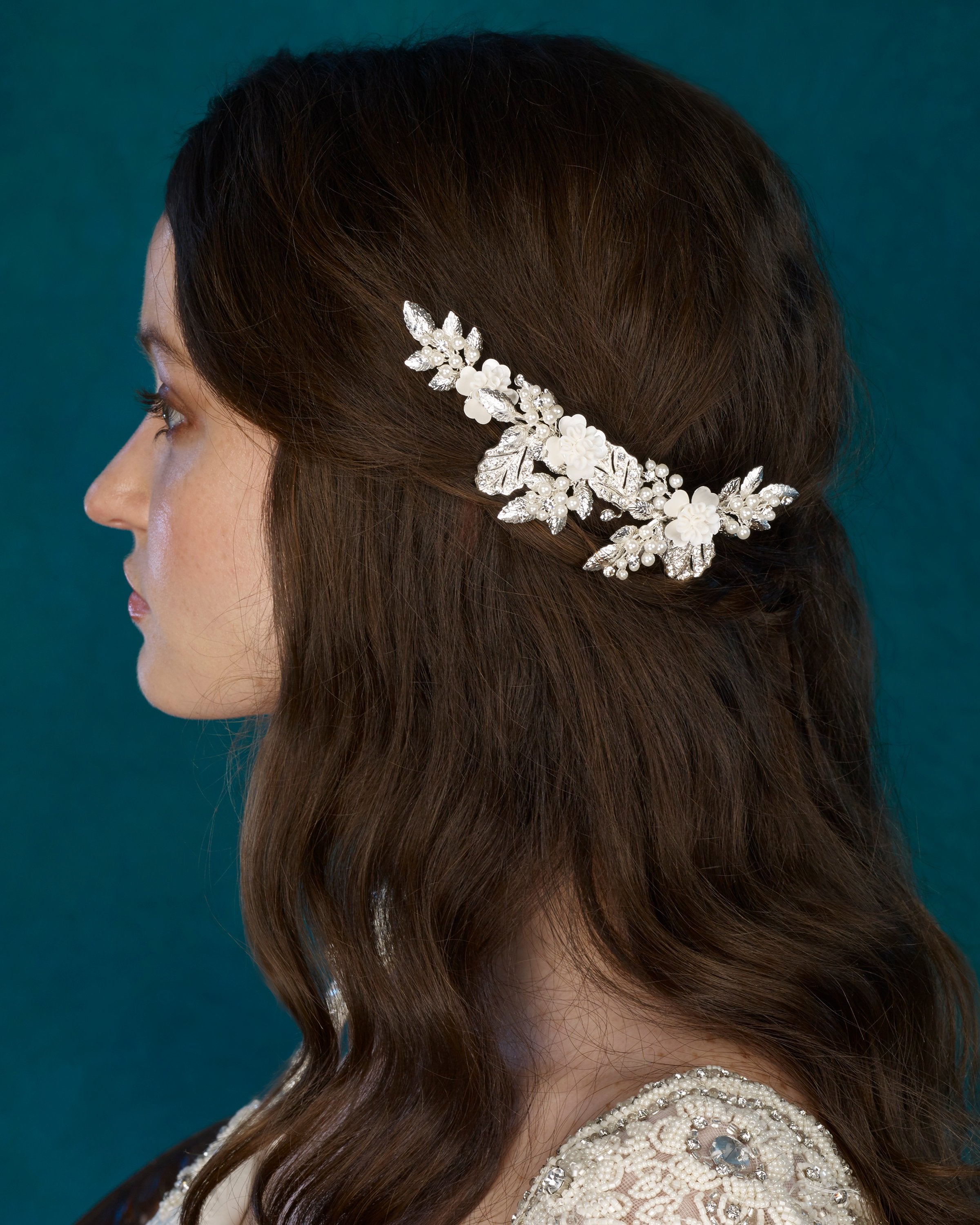 Gold or silver clip with rhinestones, pearls, metal leaves, and porcelain flowers