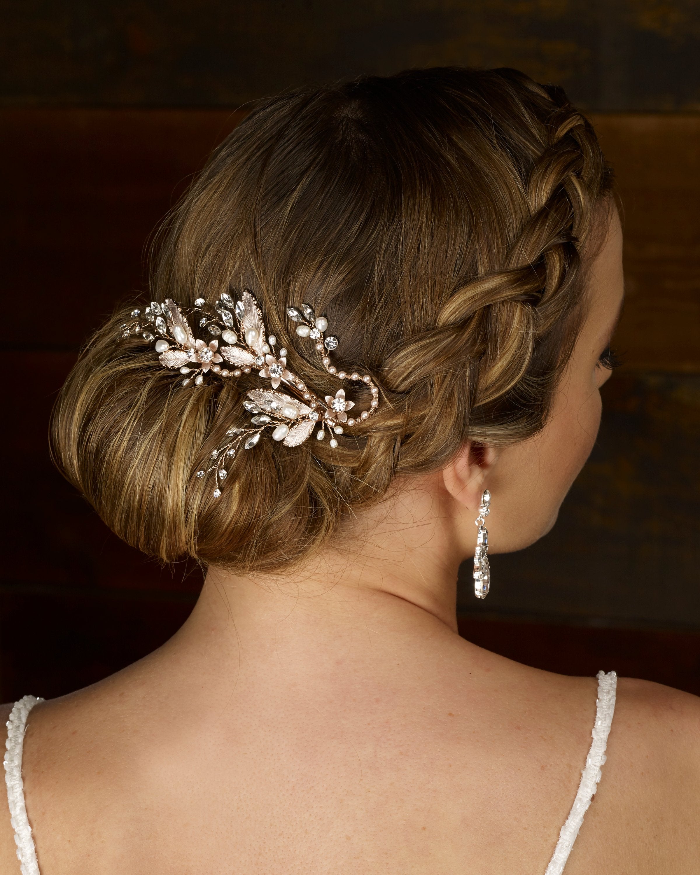 Rhinestone and pearl spray clip, with metal leaves, available in rose gold or silver