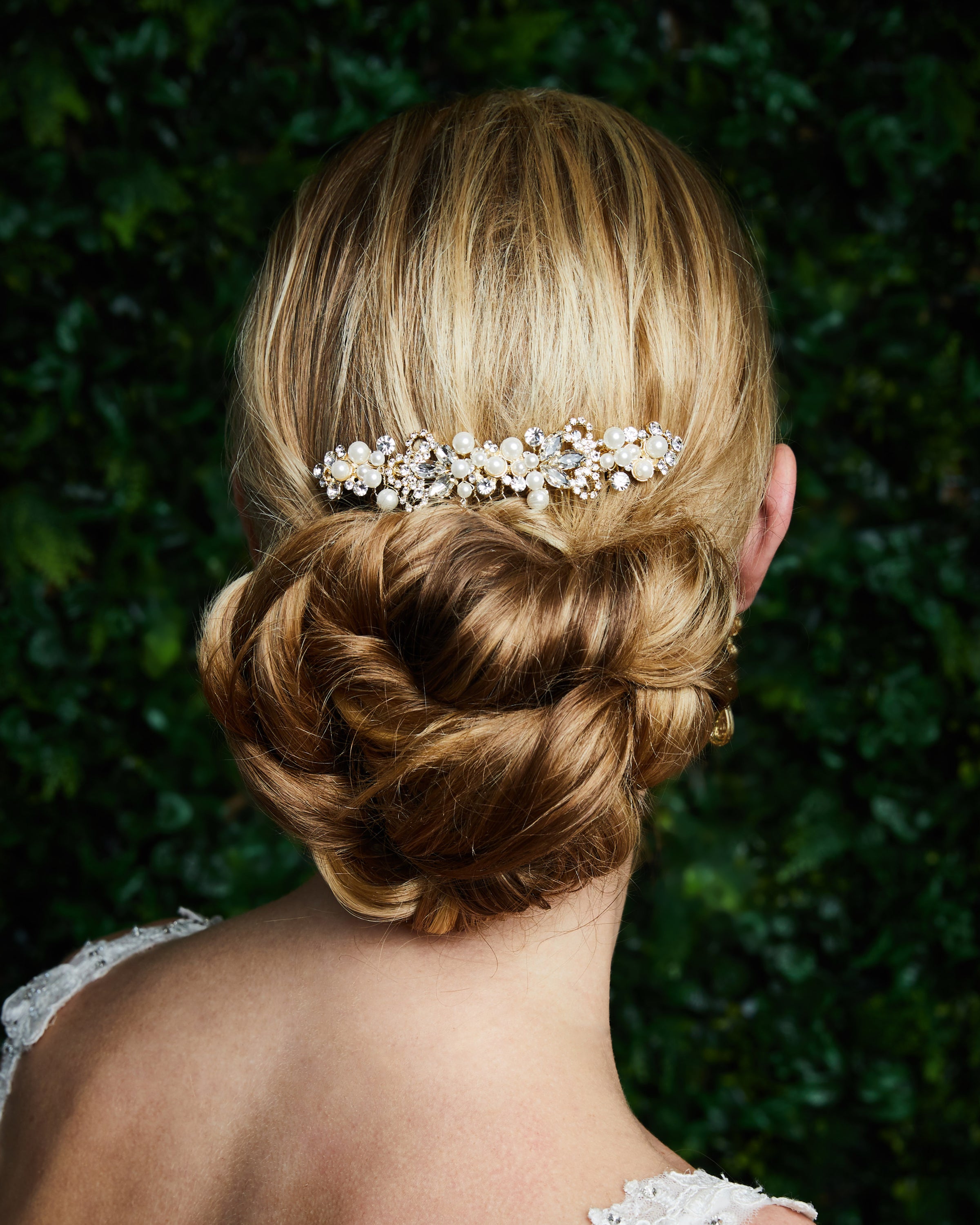 Rhinestone and pearl comb (back comb). Available in gold or silver