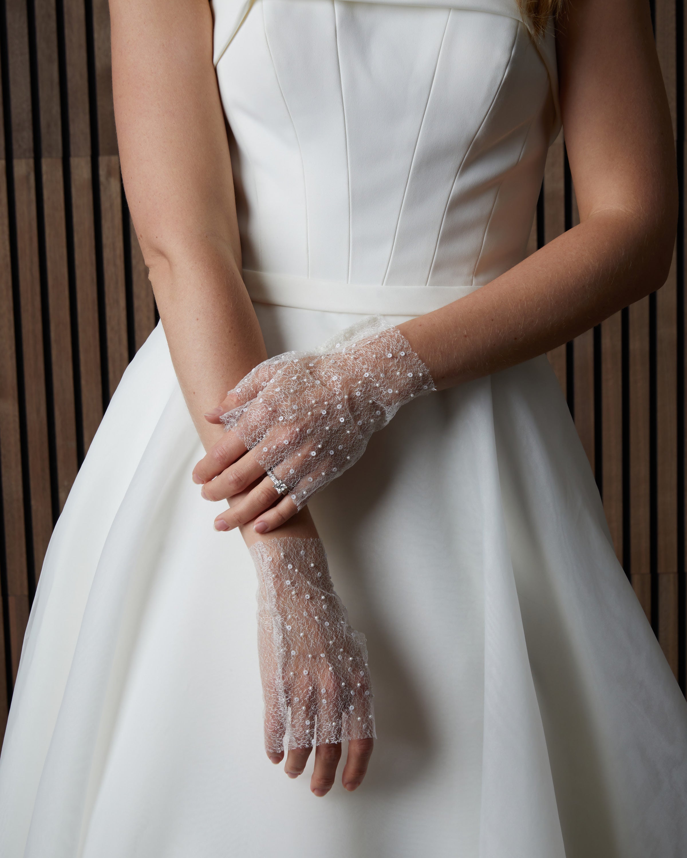Our bridal gloves are designed to add a refined, fashion forward finish to a bride’s look. Crafted in soft tulle, smooth satin, and delicate lace, our styles range from minimalist to embellished. With options including fingerless designs, wristlets, and elegant elbow length silhouettes, our glove collection offers timeless accents with modern versatility.