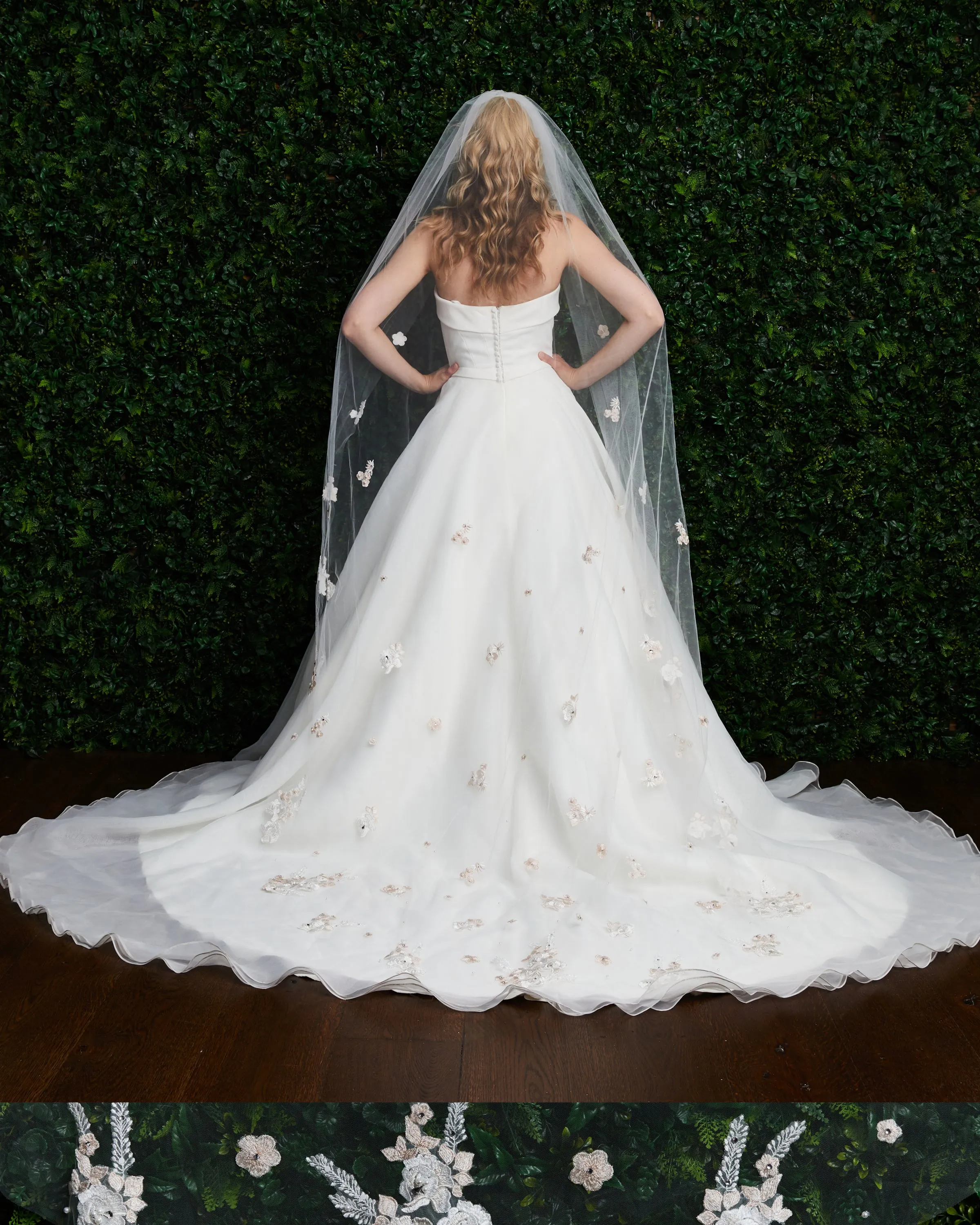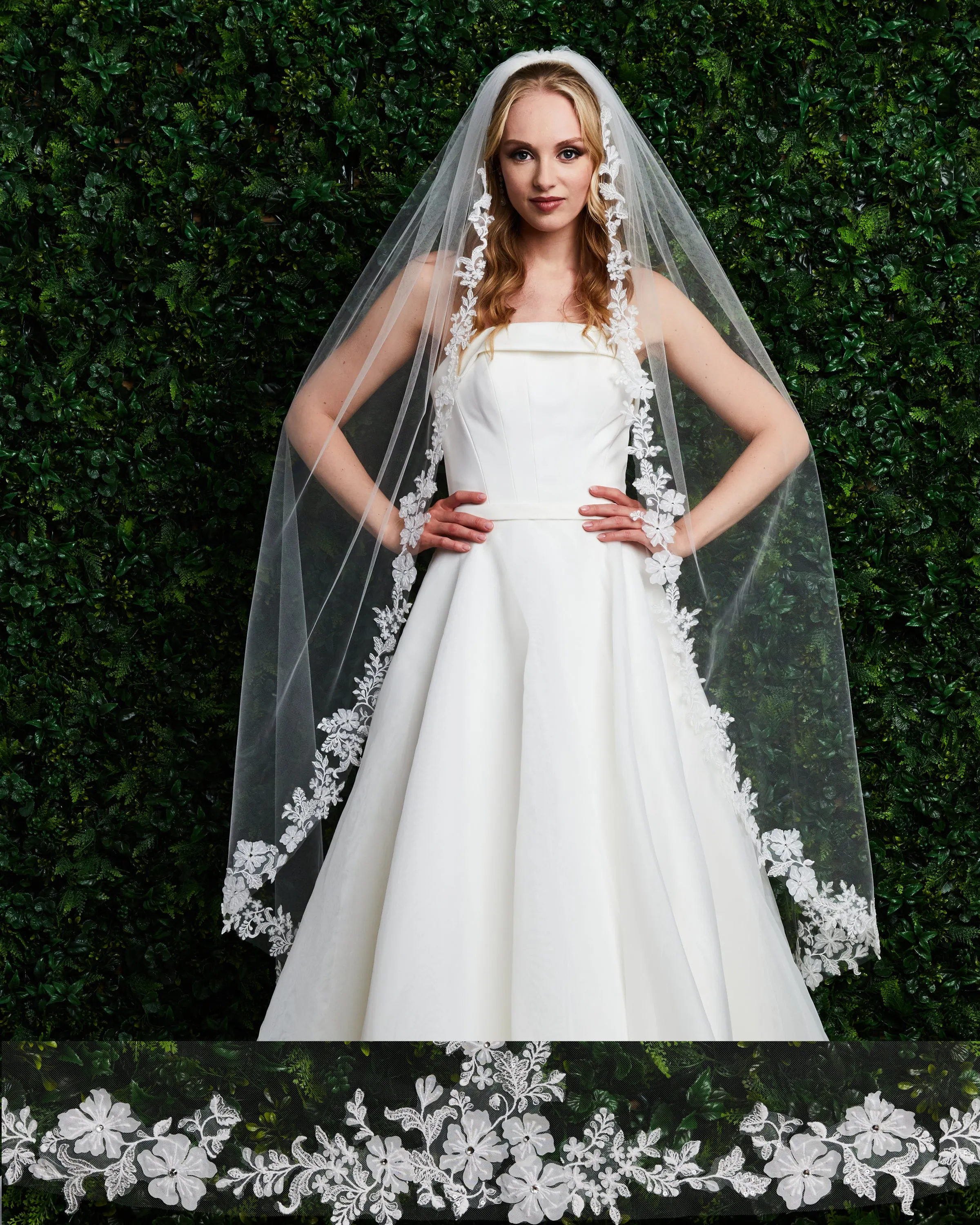 Peach, blush and green floral lace applique veil. Lace starts 42” down