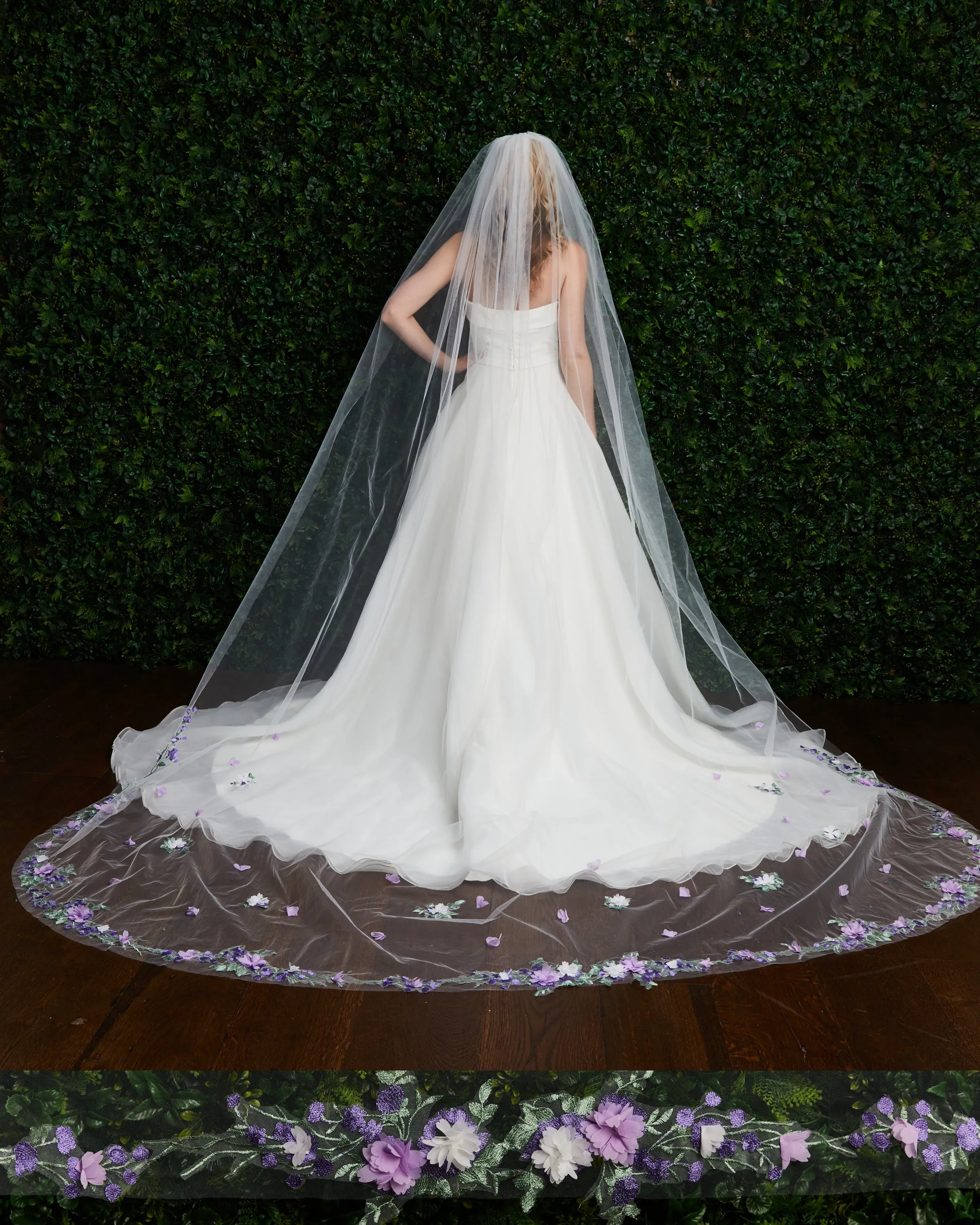 Purple floral lace applique veil with 3D flowers and lace around bottom U