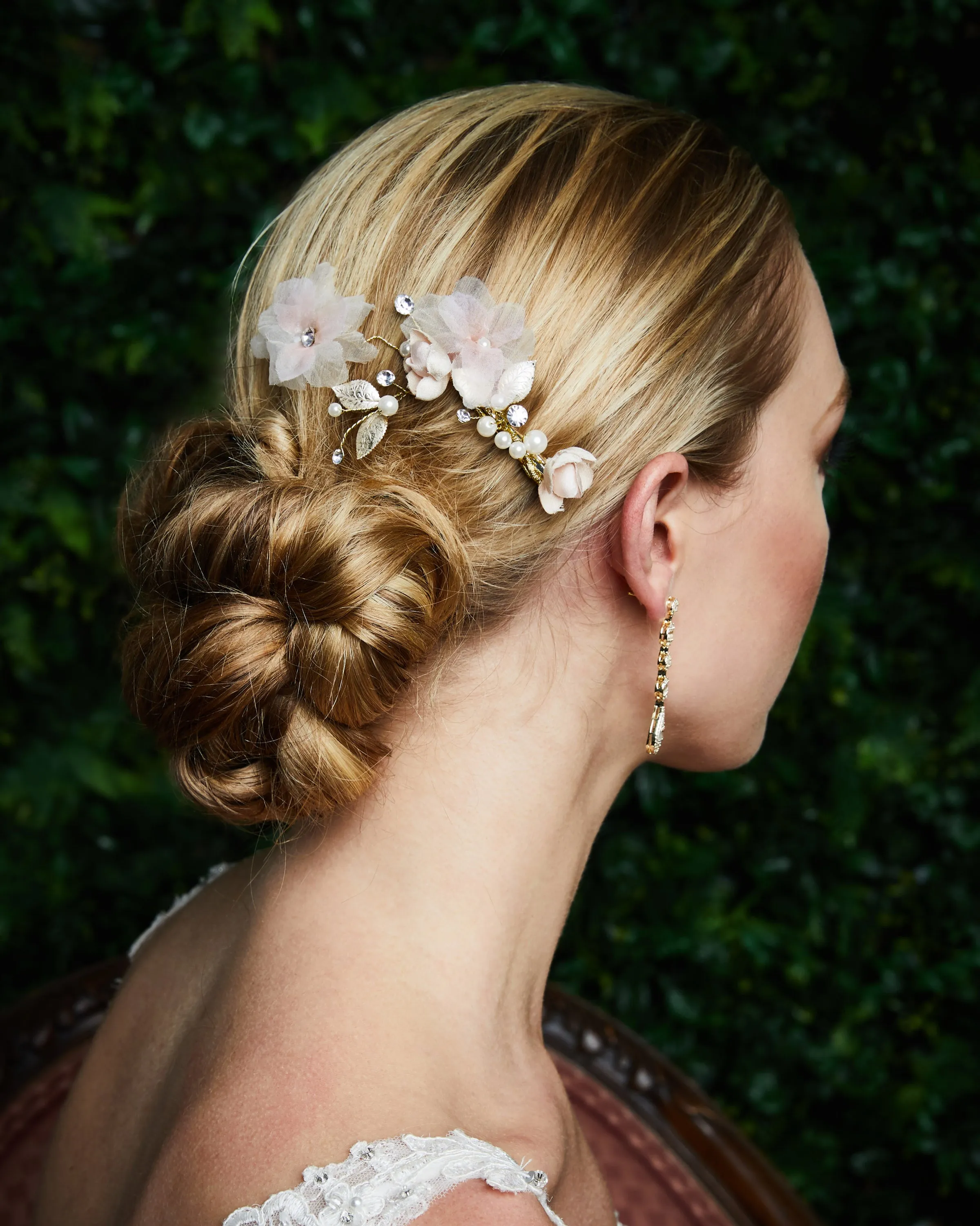 Embroidered floral clip with rhinestones and metal leaves with blush pink