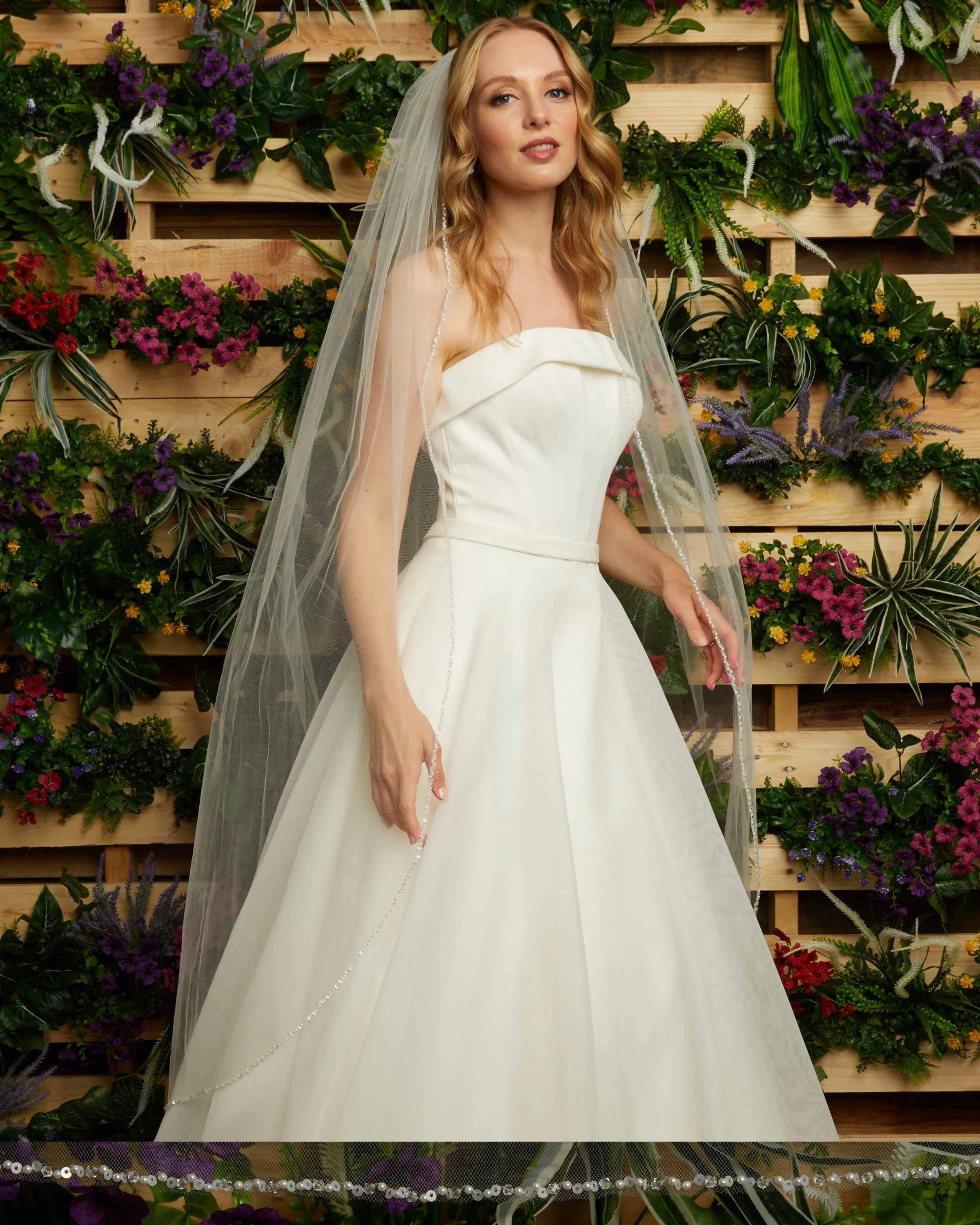 Foldover veil with 3D organza flowers with scattered pearls and beads