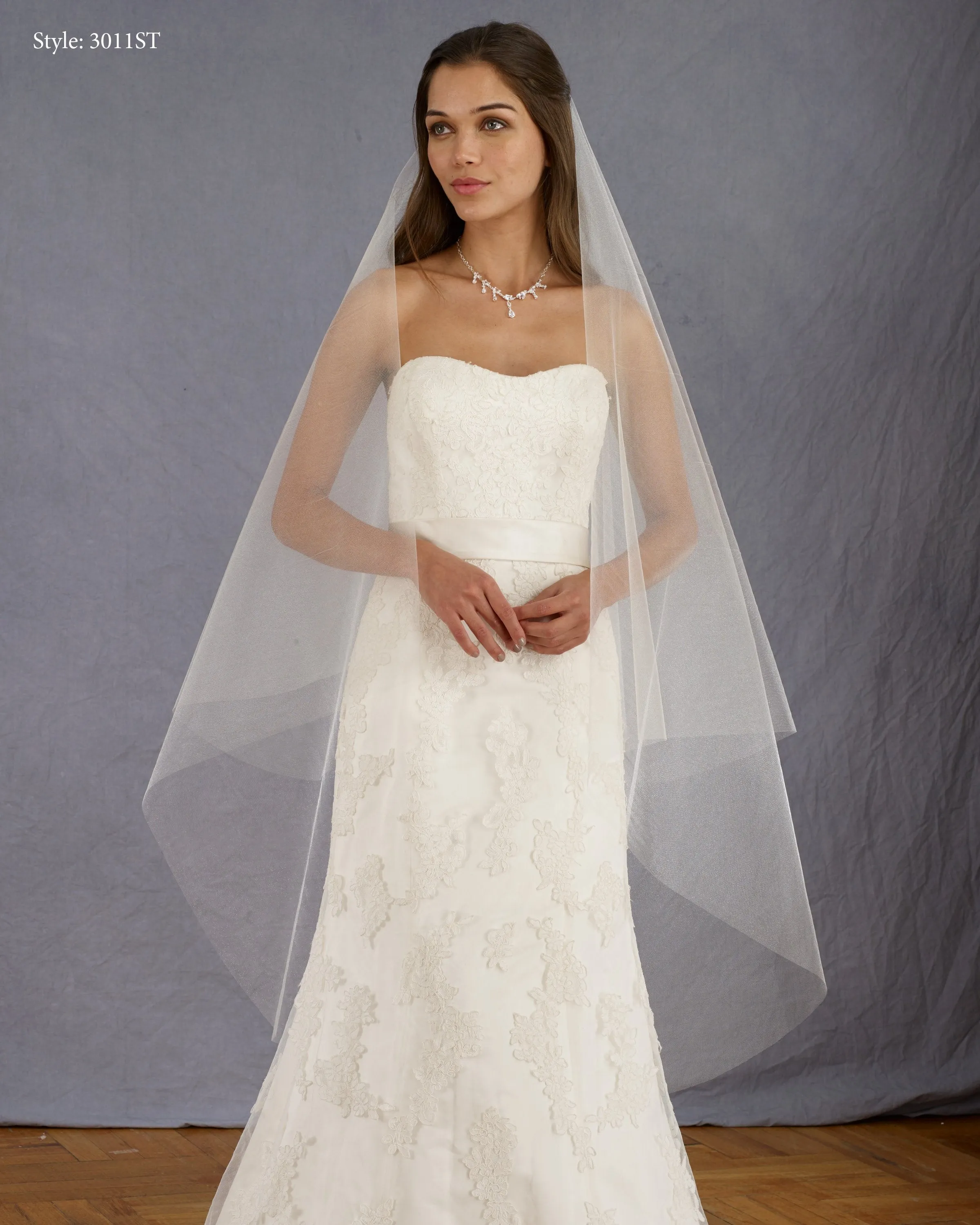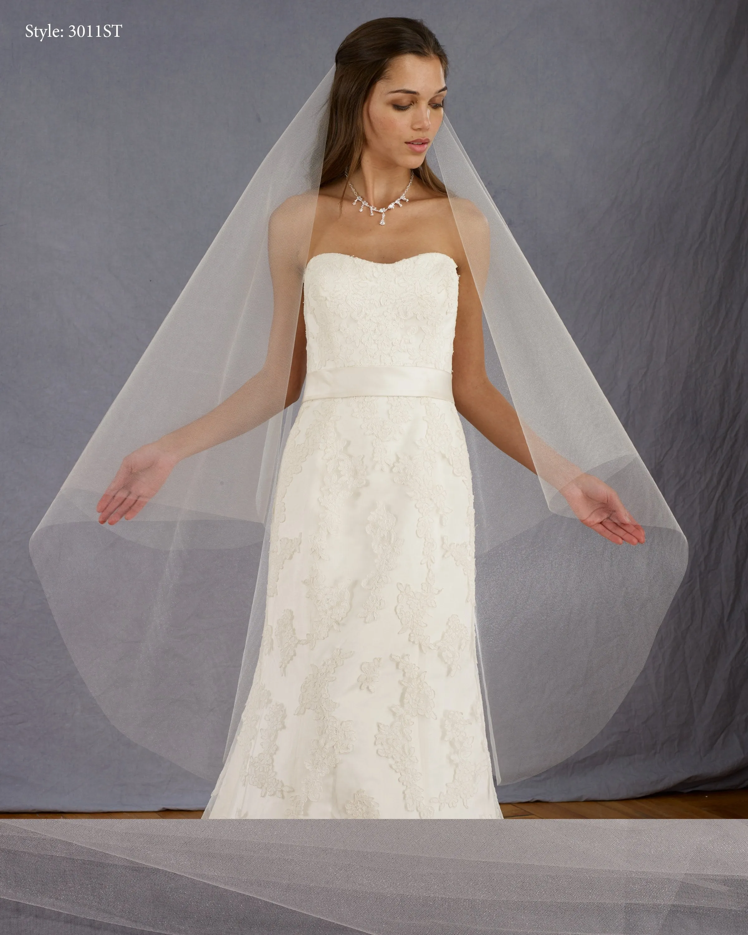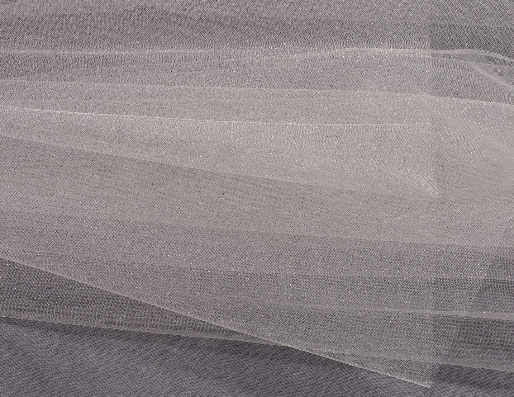 Foldover veil with a cut edge, no gathers on a metal comb. Shown in sparkle tulle. Sparkle tulle is avaliable in white and ivory. Also available in regular tulle (style 3011)