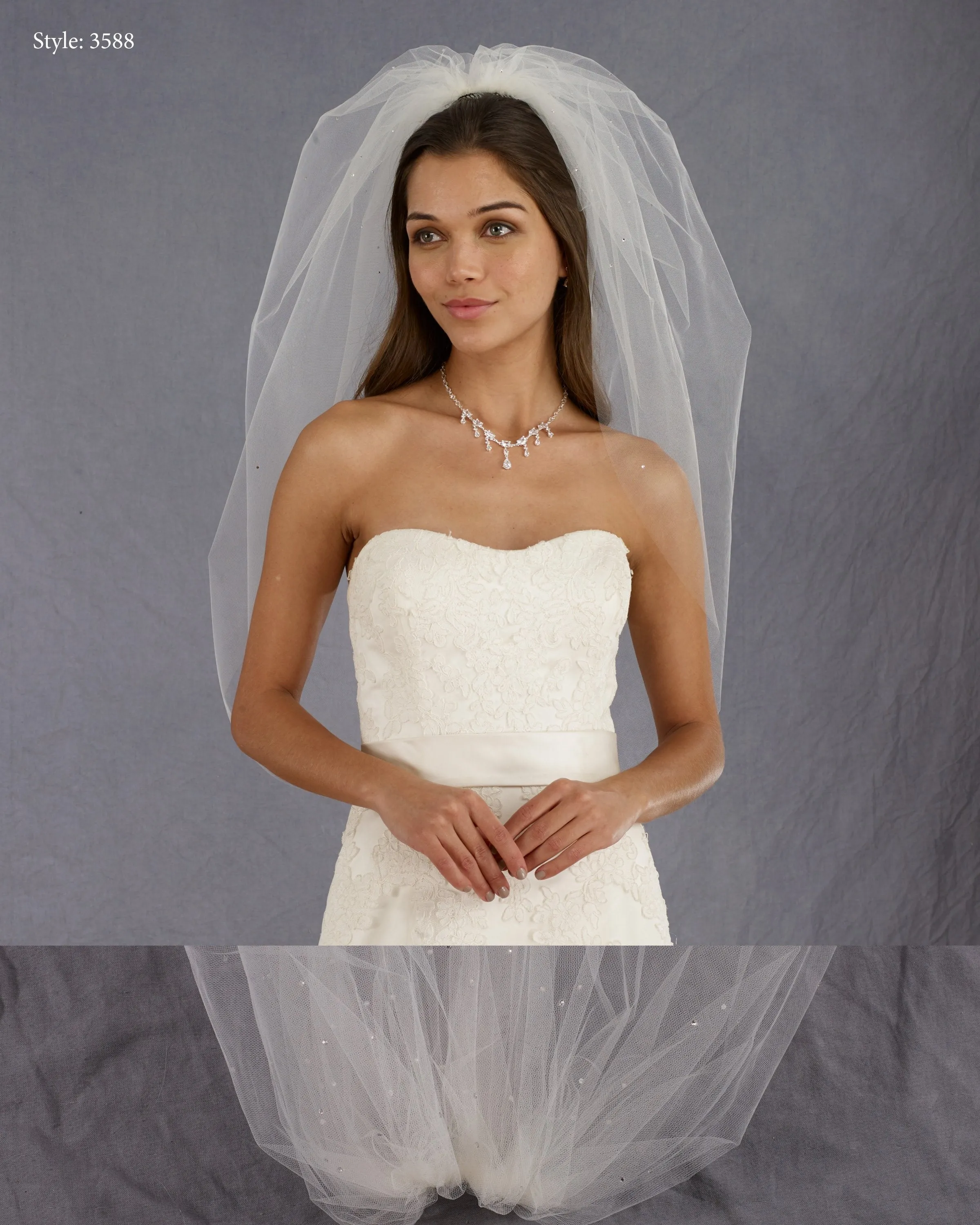 Long 1 tier bubble veil with scattered rhinestones.