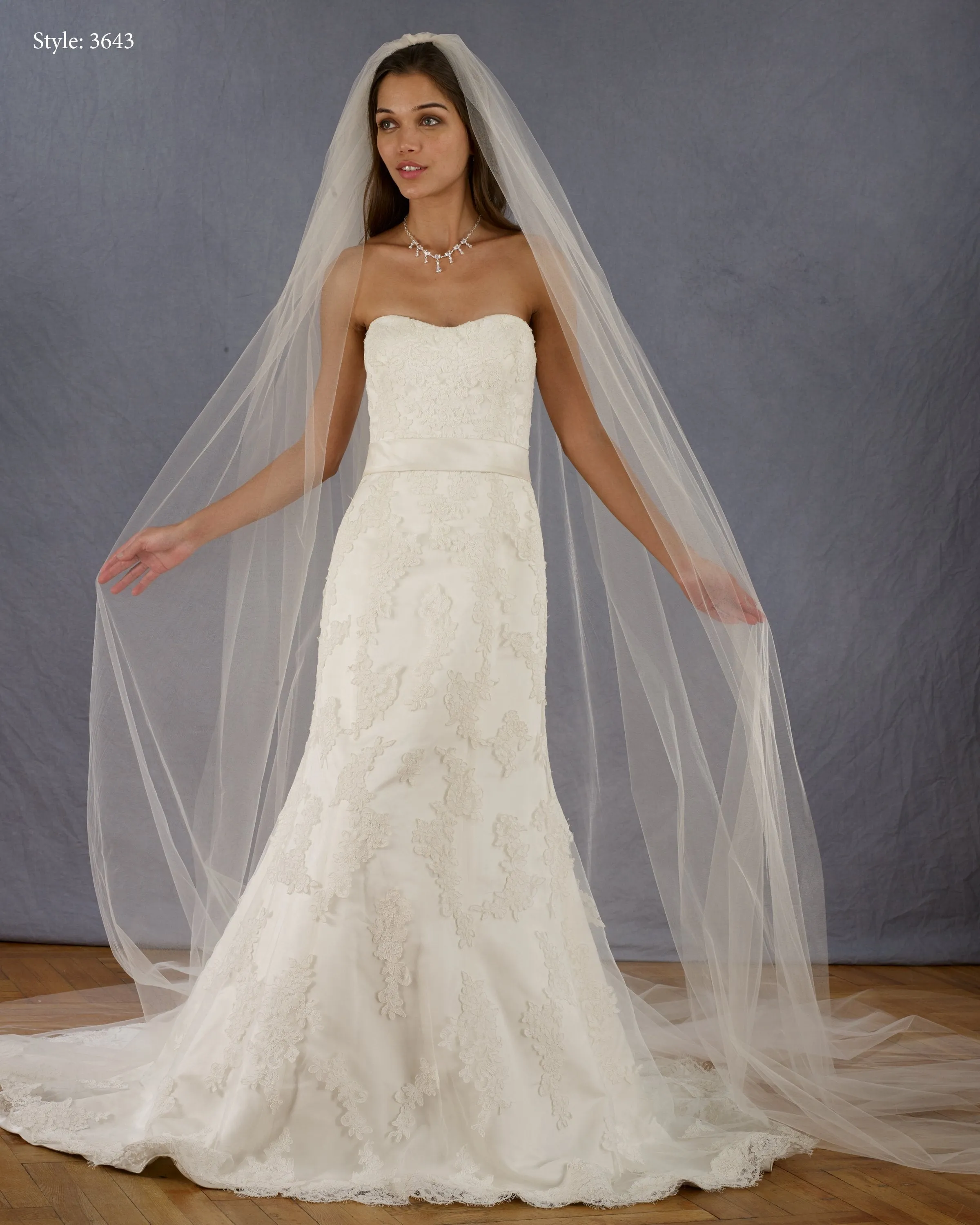 Yards wide x 108” long, cut edge - 3 veils, each veil has an 18”top and 108” bottom.
