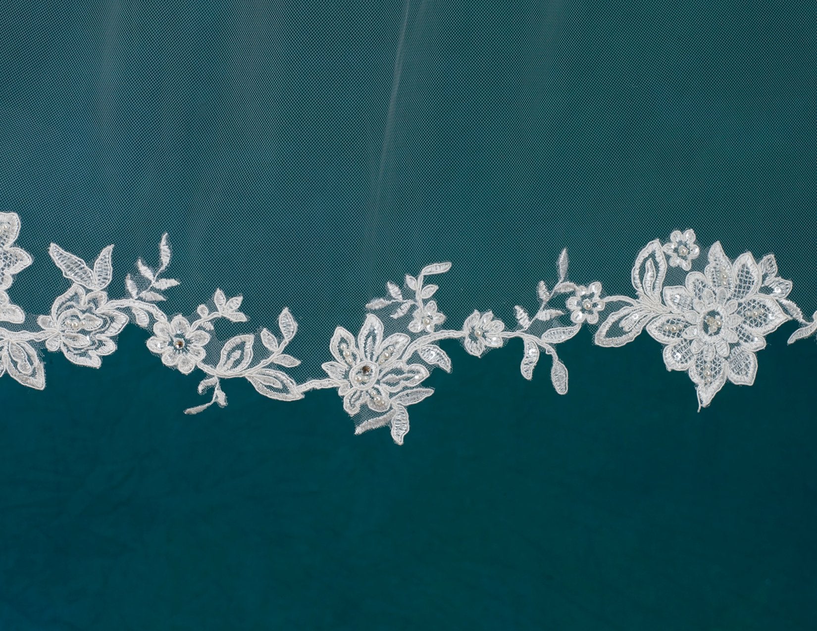 Lace veil with sequins. Lace starts 65” down