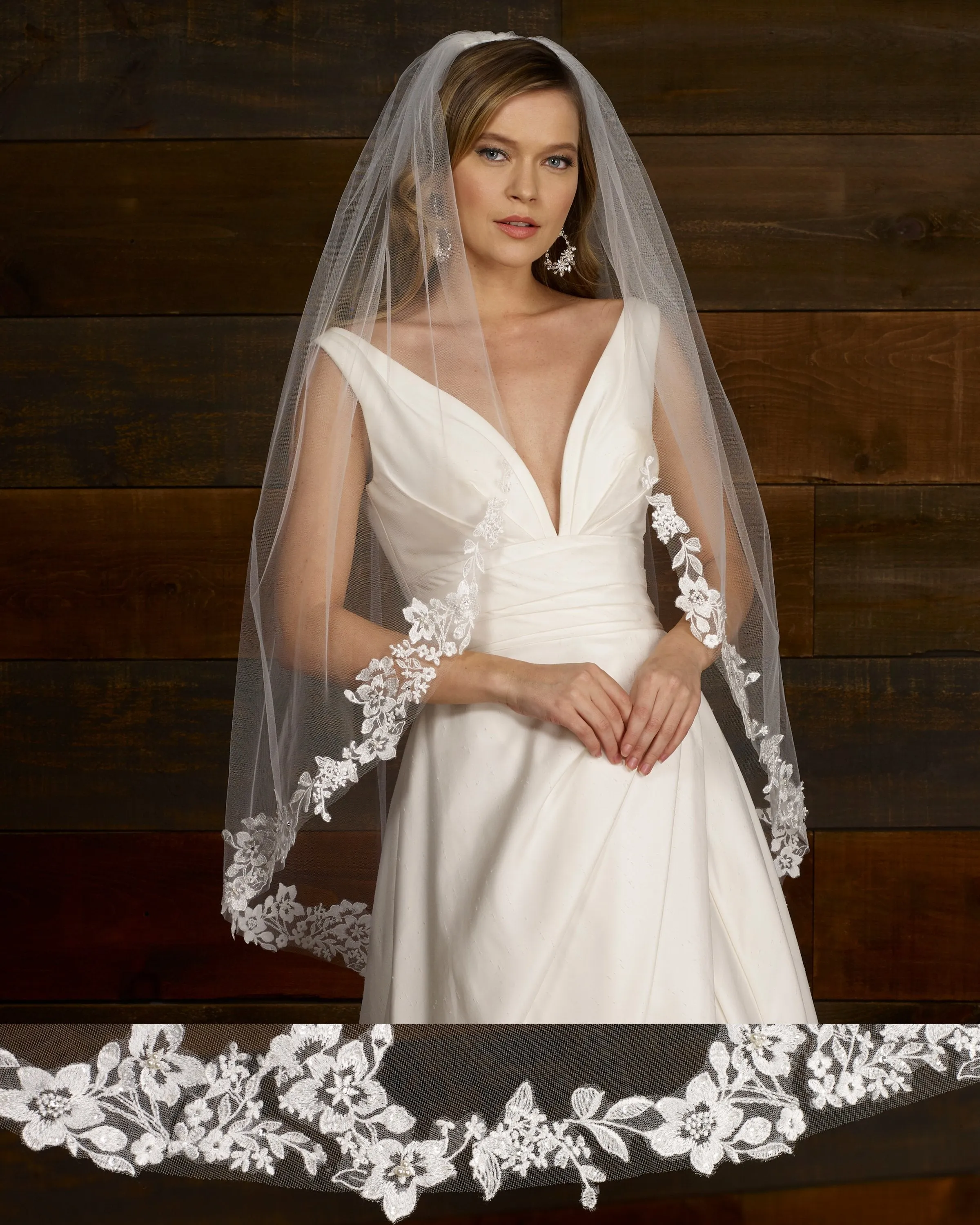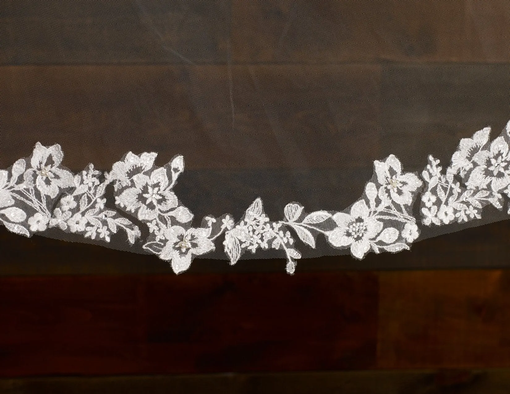 Floral lace with pearls and rhinestones, lace starts 19” down