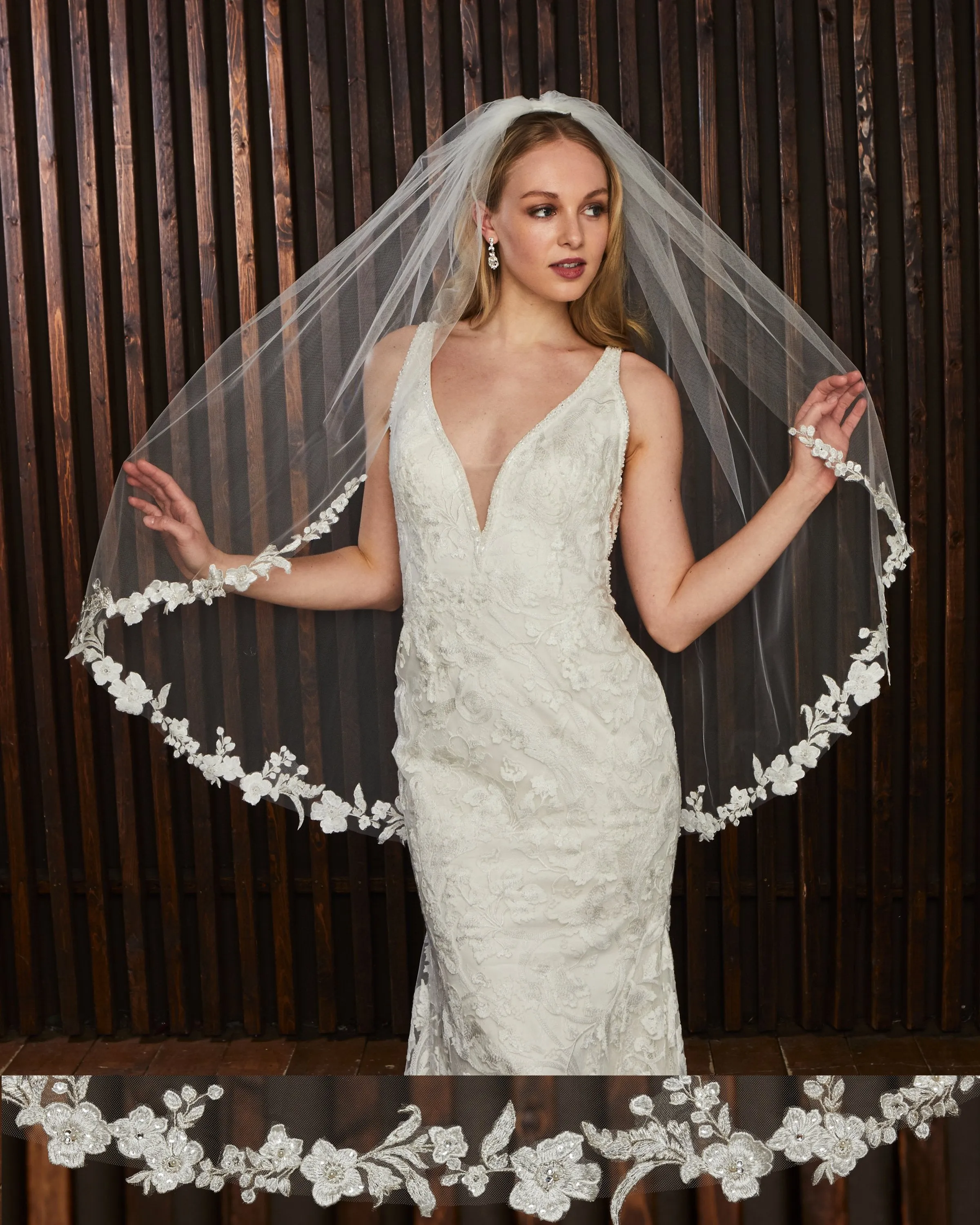 Cut out floral lace with pearls and rhinestones. Lace starts 19” down