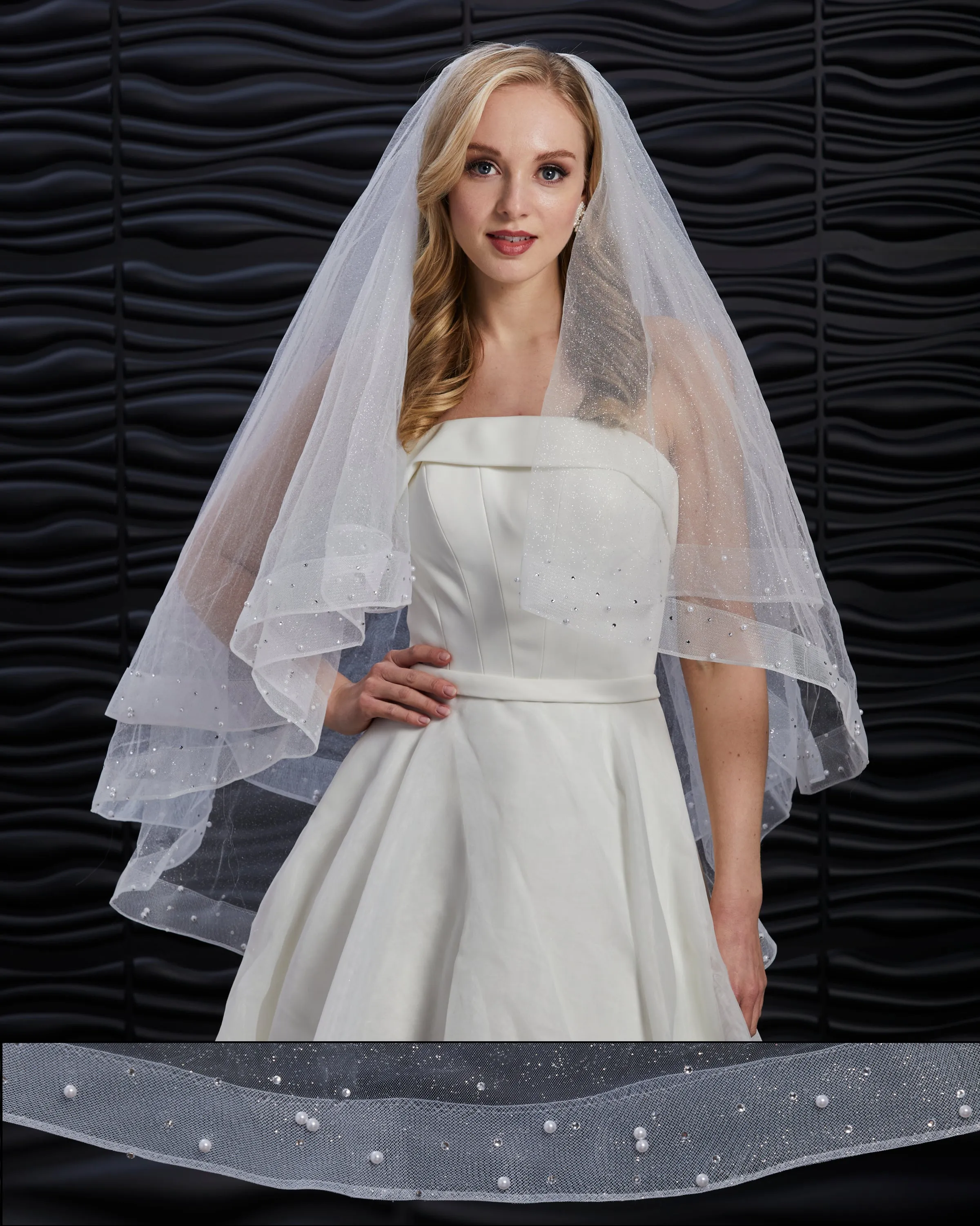 Foldover horsehair glitter tulle veil with scattered rhinestones and pearls