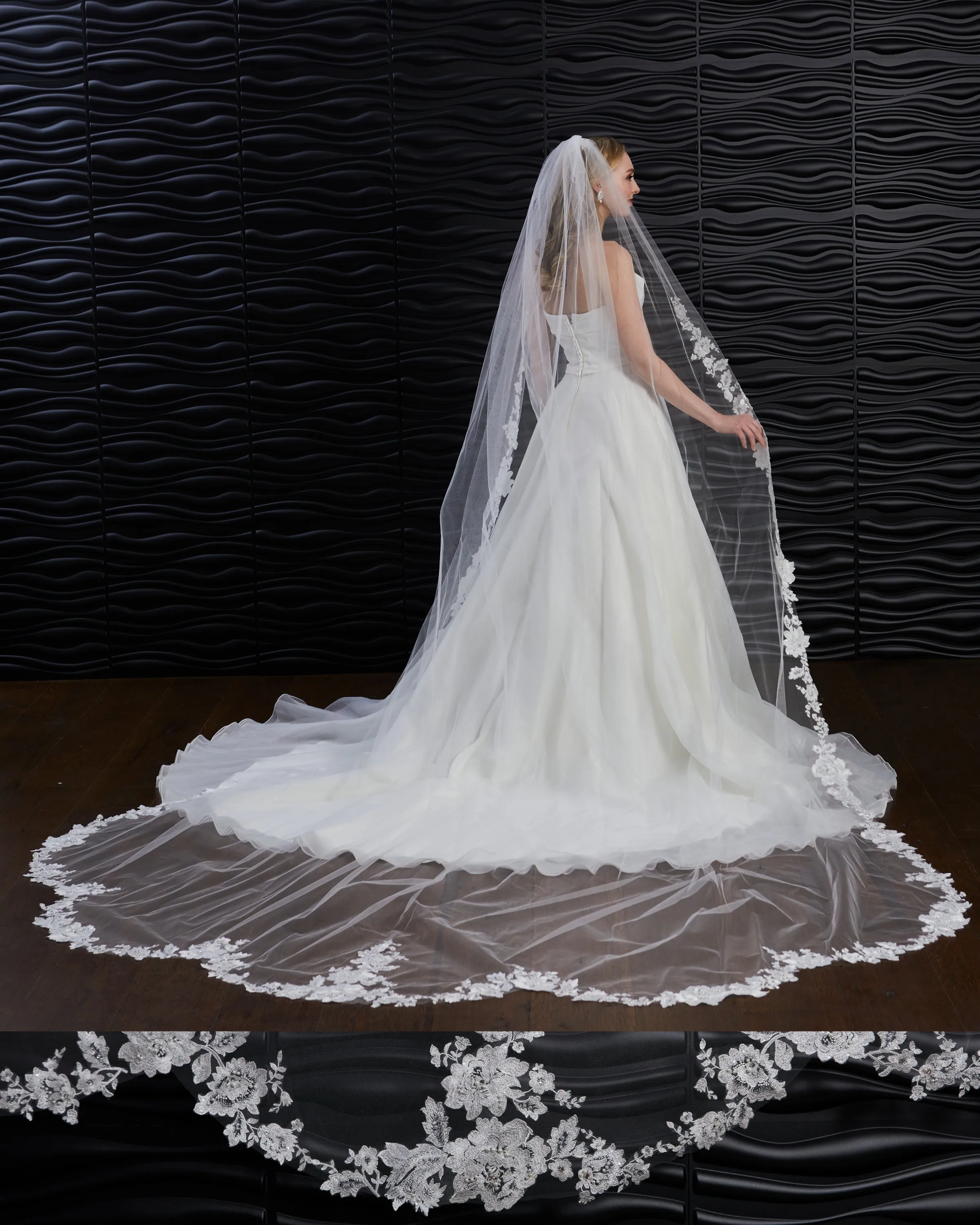 Scalloped veil (5 scallops) with cut out floral lace with beads, sequins, pearls and rhinestones. Lace starts 18” down.
