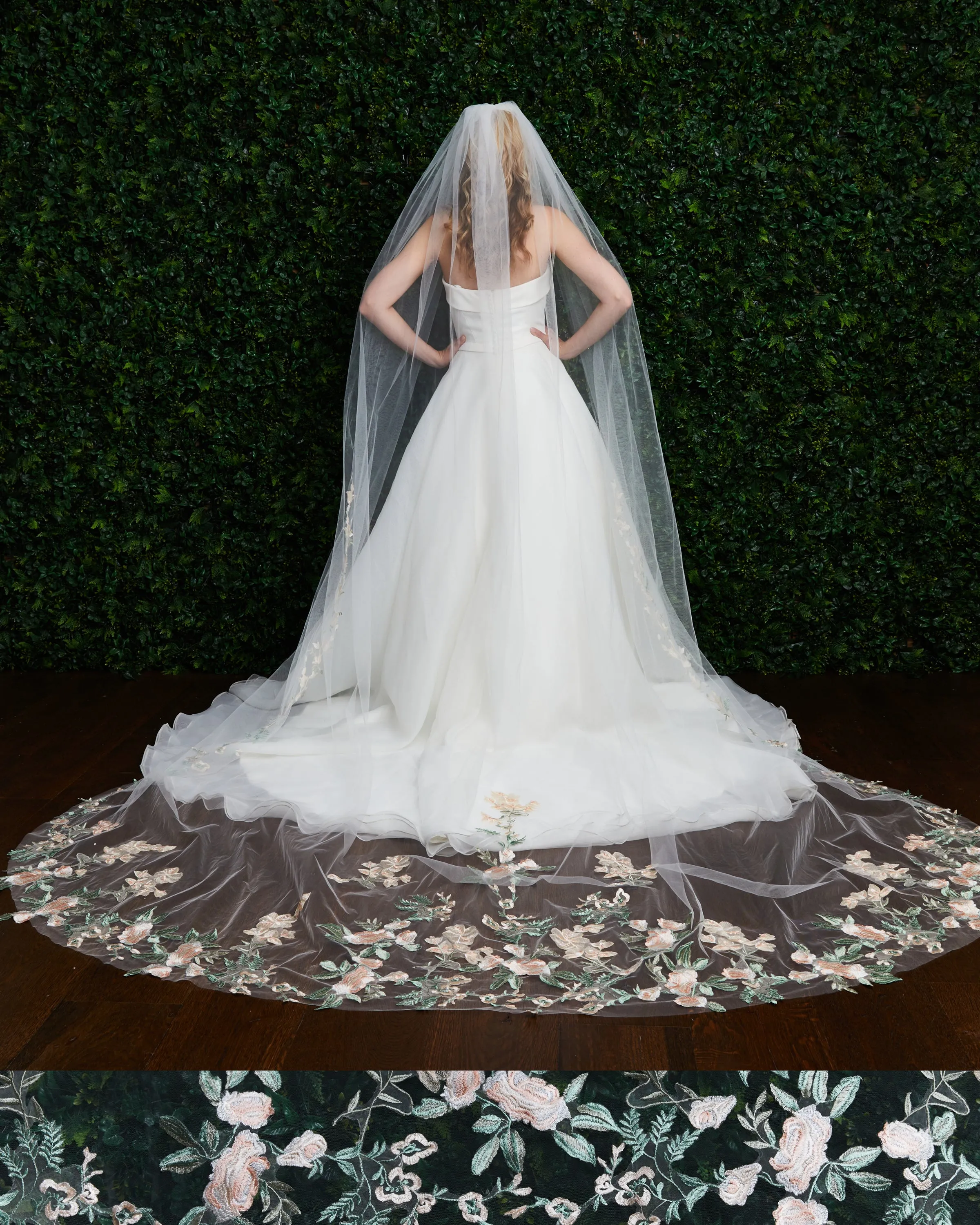 Peach, blush and green floral lace applique veil. Lace starts 42” down