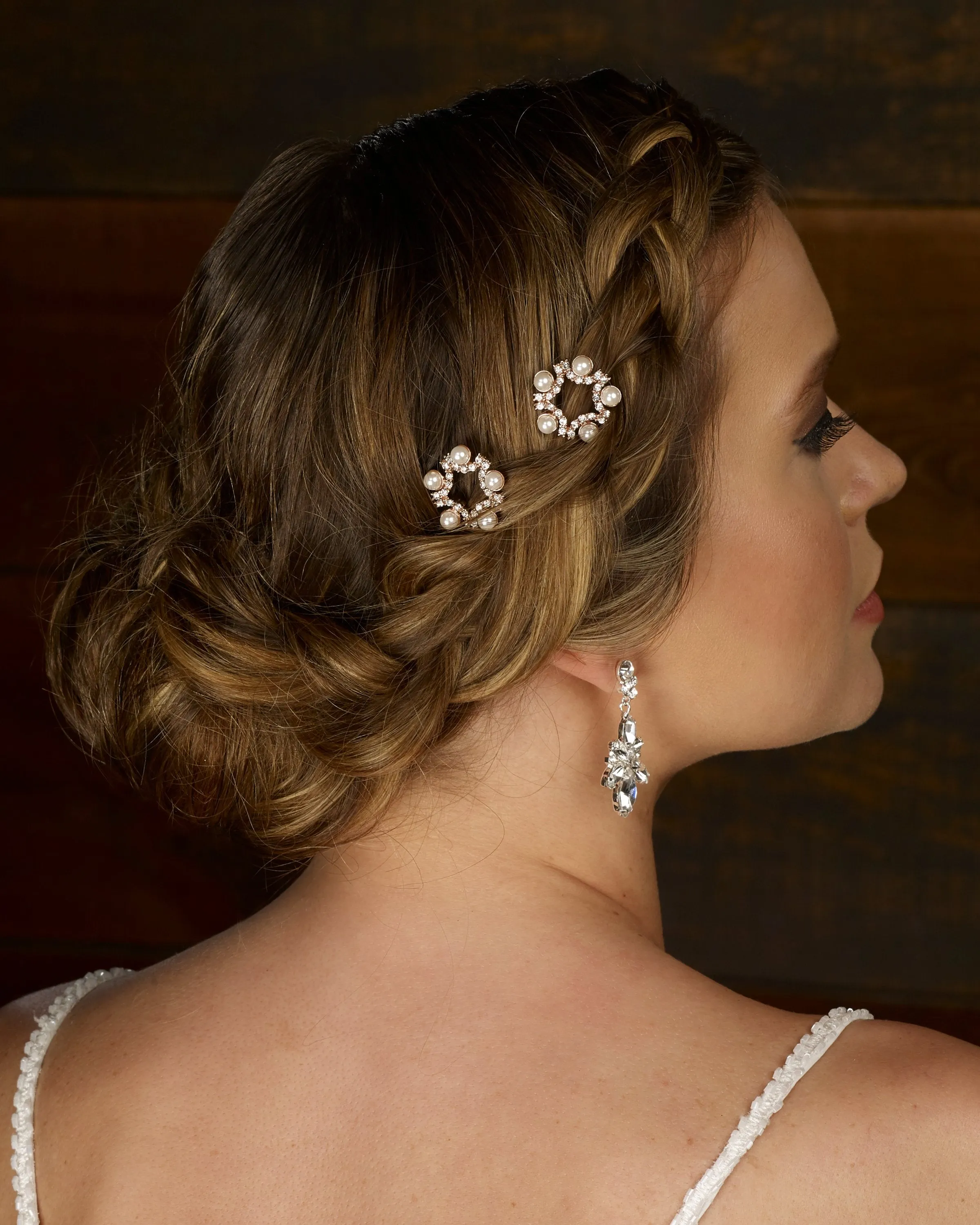 Bobby pin set of 2, rhinestone and pearl circle, available in rose gold or silver