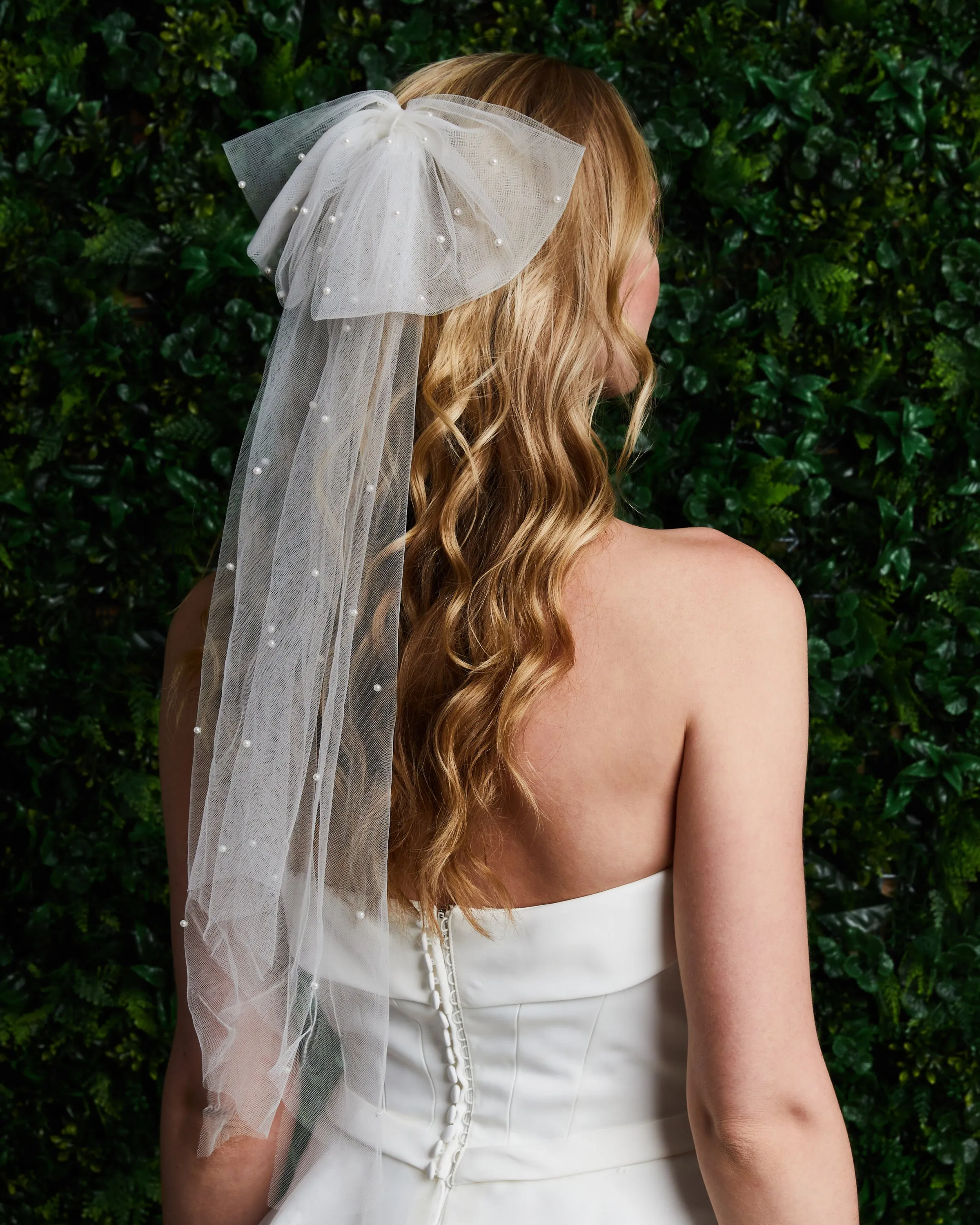 Soft luxe tulle bow with scattered pearls. Bow 10” Wide, 8” long. Tails 24” long