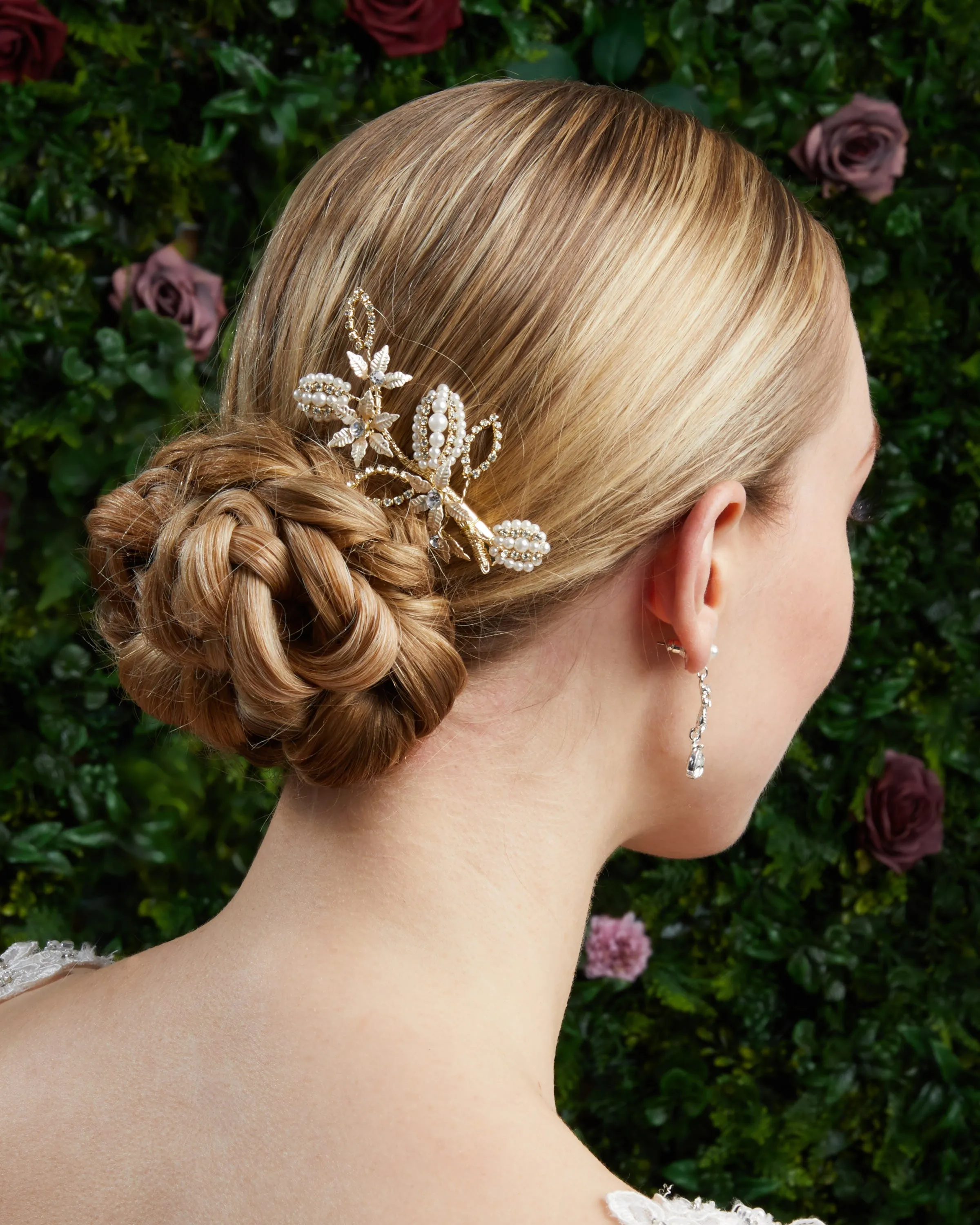 Clip with pearls, rhinestones and metal flowers. Available in gold or silver