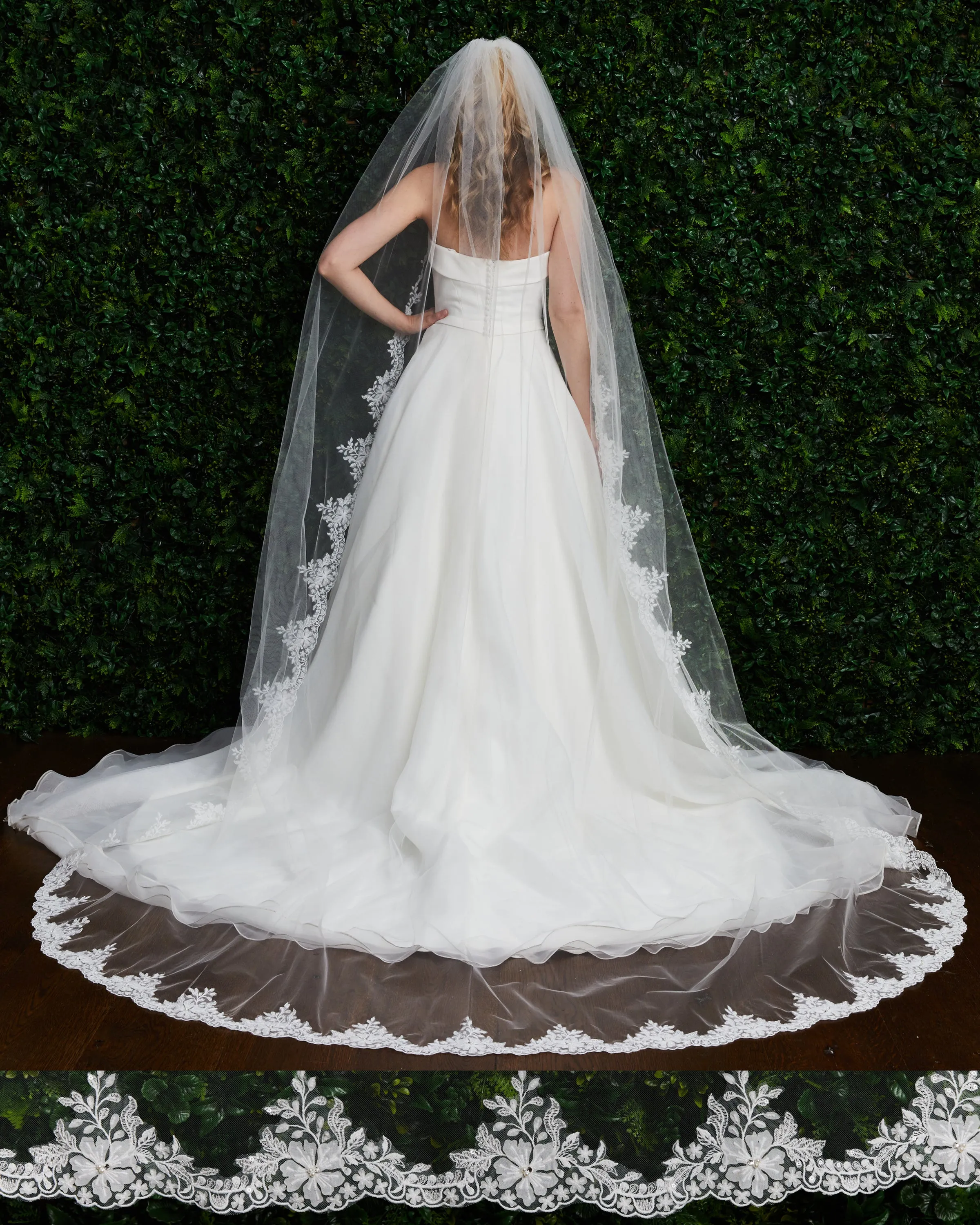 Tapered scalloped floral lace with sequins, pearls and rhinestones. Lace starts 18” down