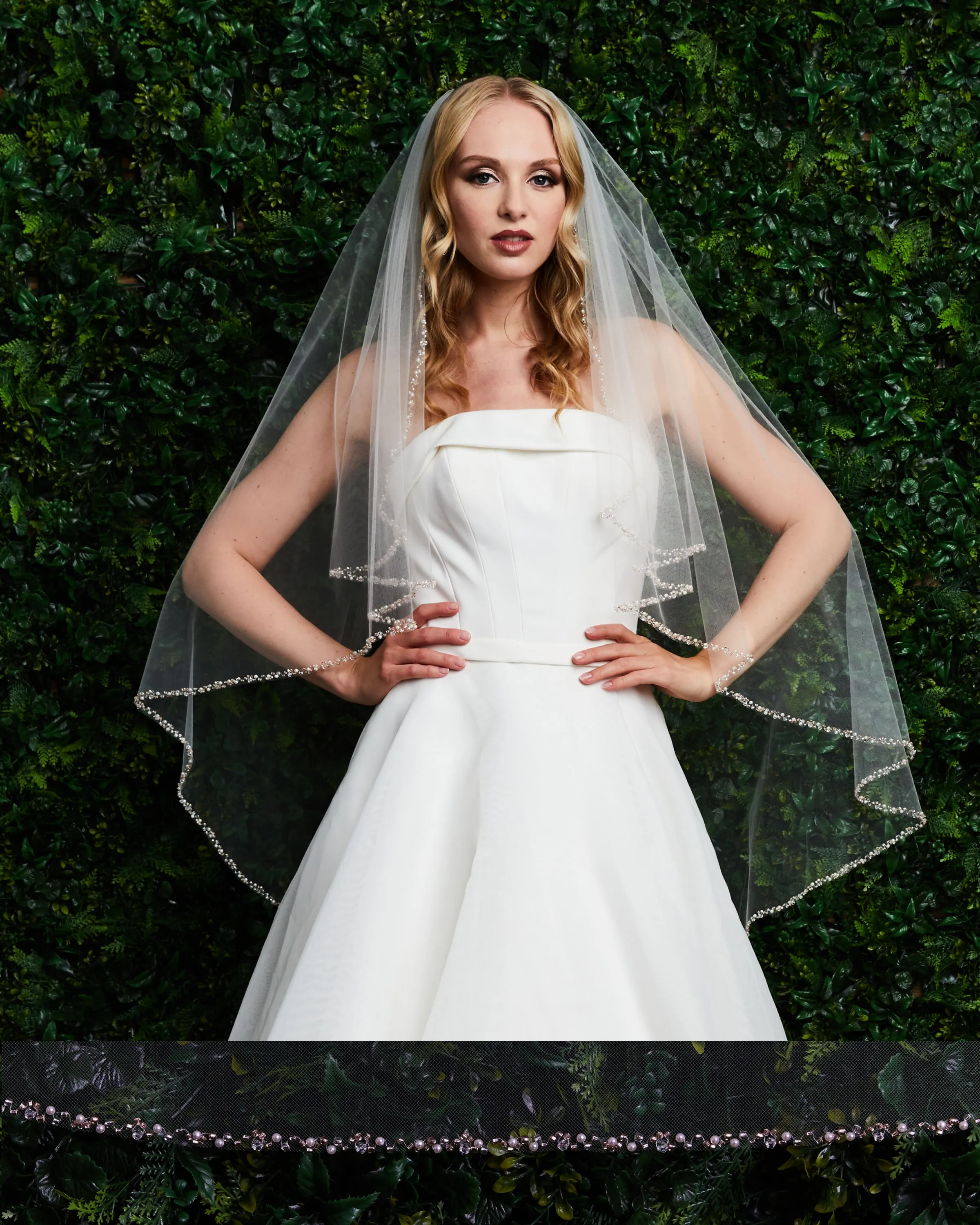 Angel cut beaded edge veil with pearls and crystals. Available in ivory/pink or ivory/ivory