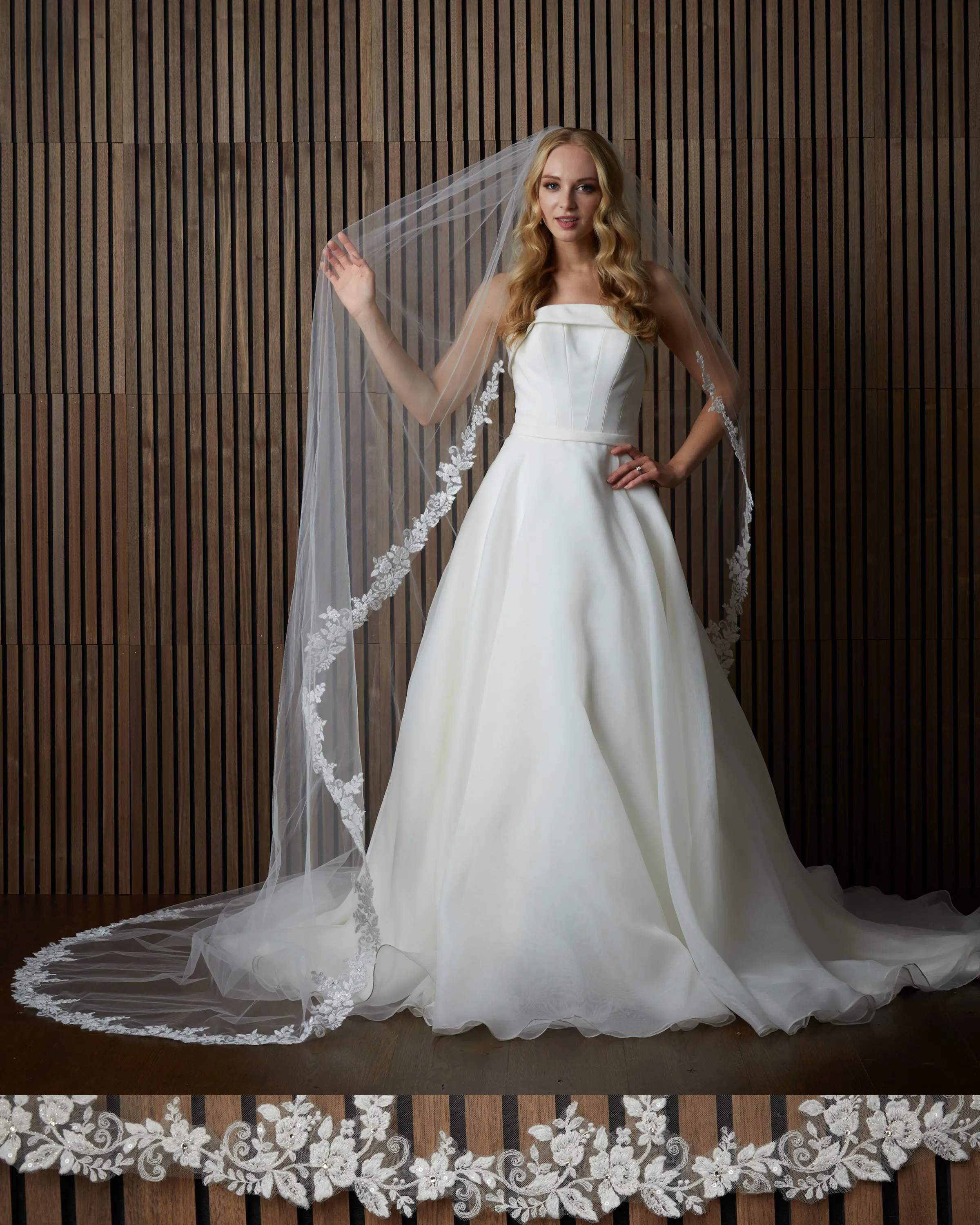 Lace edge veil with rhinestones. Lace starts 19” down.